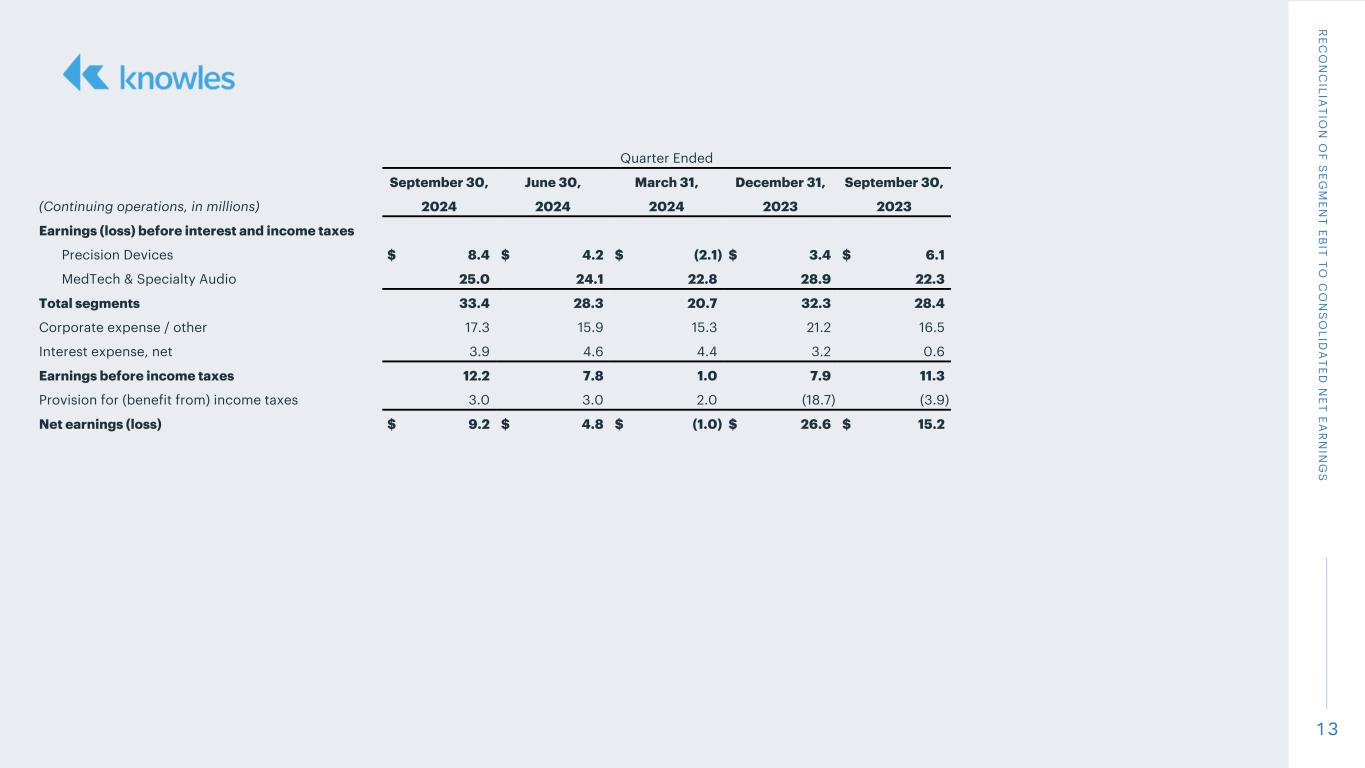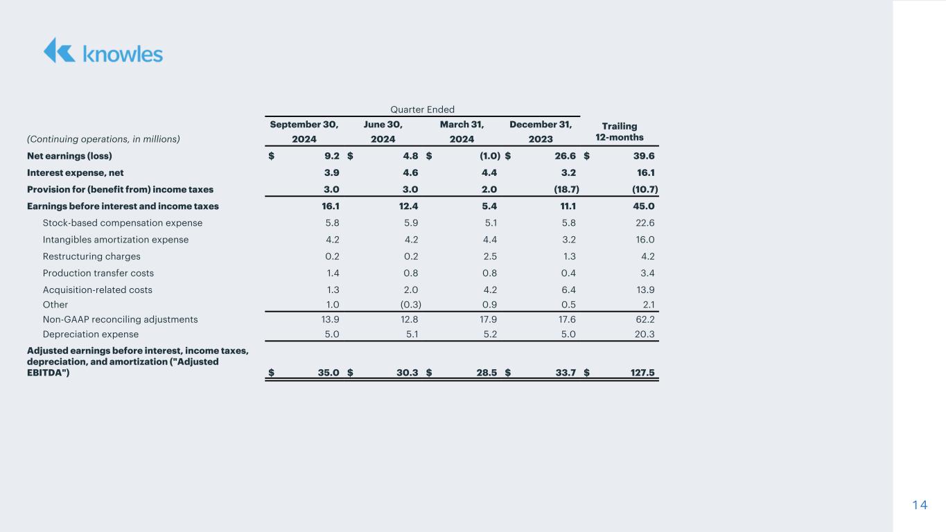 1 3 R EC O N C ILIA TIO N O F S EG M EN T EB IT TO C O N S O LID A TED N ET EA R N IN G S Quarter Ended September 30, June 30, March 31, December 31, September 30, (Continuing operations, in millions) 2024 2024 2024 2023 2023 Earnings (loss) before interest and income taxes Precision Devices $ 8.4 $ 4.2 $ (2.1) $ 3.4 $ 6.1 MedTech & Specialty Audio 25.0 24.1 22.8 28.9 22.3 Total segments 33.4 28.3 20.7 32.3 28.4 Corporate expense / other 17.3 15.9 15.3 21.2 16.5 Interest expense, net 3.9 4.6 4.4 3.2 0.6 Earnings before income taxes 12.2 7.8 1.0 7.9 11.3 Provision for (benefit from) income taxes 3.0 3.0 2.0 (18.7) (3.9) Net earnings (loss) $ 9.2 $ 4.8 $ (1.0) $ 26.6 $ 15.2