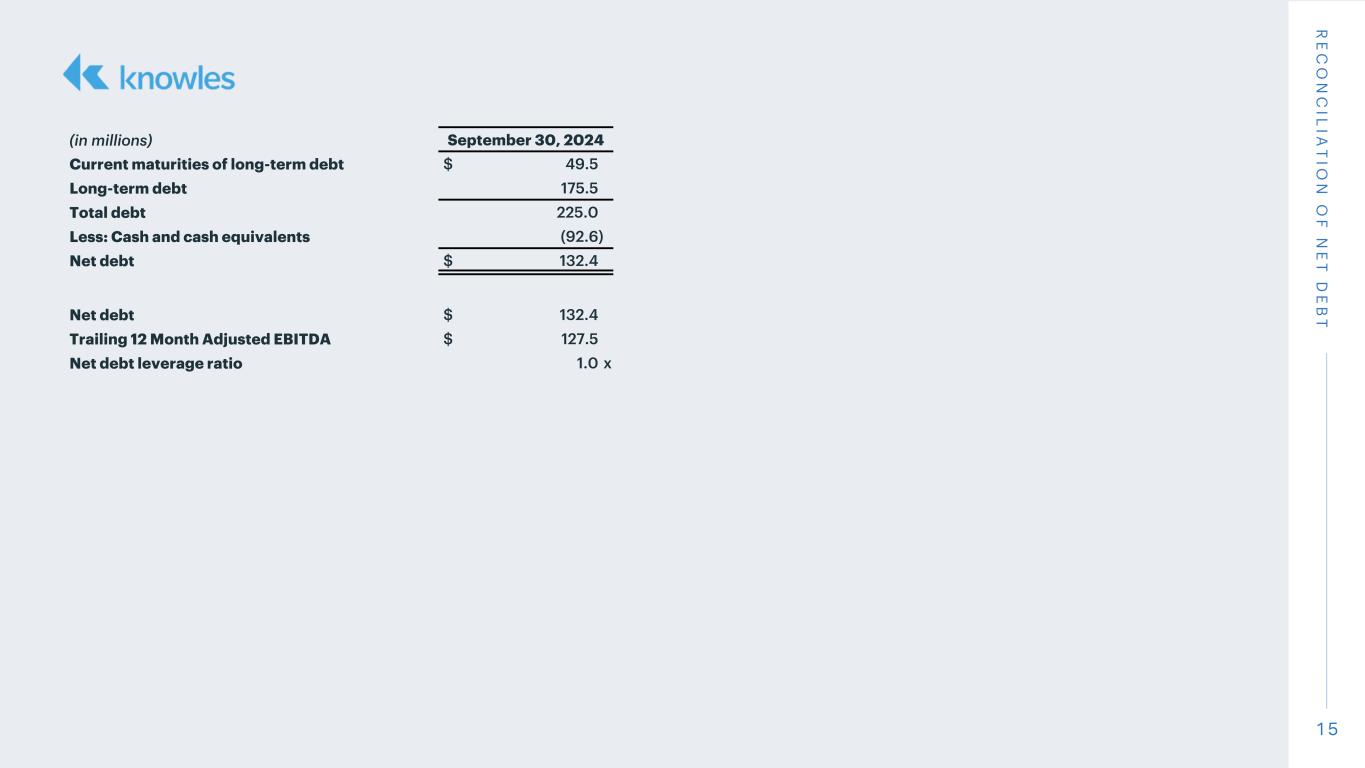 ITASCA, Ill., October 24, 2024 - Knowles Corporation (NYSE: KN) (“Knowles” or the “Company” ), a leading global supplier of high-performance electronics for demanding applications, including capacitors and radio frequency (“RF”) filters, advanced medtech microphones, and balanced armature speakers, today announced results for the quarter ended September 30, 2024.
