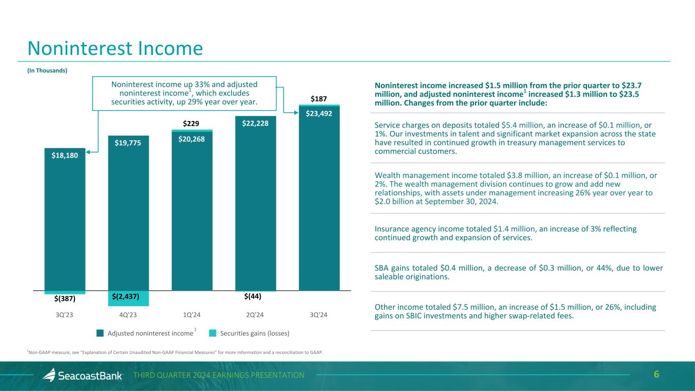 •Service charges on deposits totaled $5.4 million, an increase of $0.1 million, or 1%, from the prior quarter and an increase of $0.8 million, or 16%, from the prior year quarter. Our investments in talent and significant market expansion across the state have resulted in continued growth in treasury management services to commercial customers.