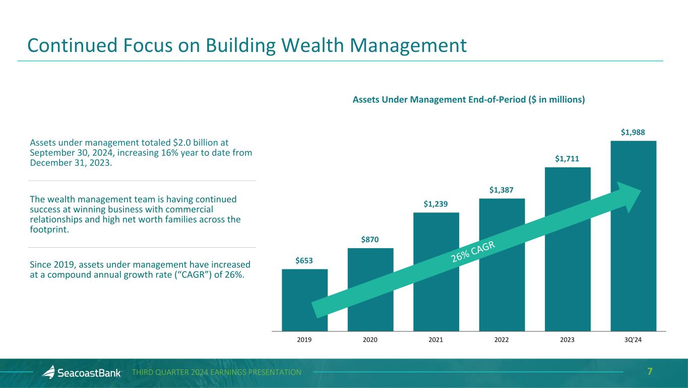 •Wealth management income totaled $3.8 million, an increase of $0.1 million, or 2%, from the prior quarter and an increase of $0.7 million, or 22%, from the prior year quarter. The wealth management division continues to grow and add new relationships, with assets under management increasing 26% year over year to $2.0 billion at September 30, 2024.