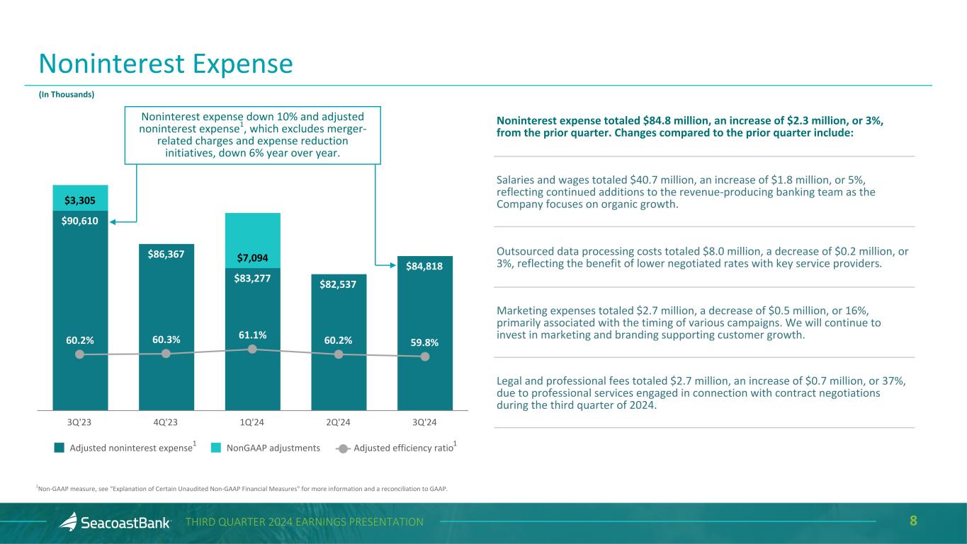 •Noninterest expense was $84.8 million in the third quarter of 2024, an increase of $2.3 million, or 3%, compared to the prior quarter, and a decrease of $9.1 million, or 10%, compared to the prior year quarter. Noninterest expense for the nine months ended September 30, 2024, totaled $257.7 million, a decrease of $51.5 million, or 17%, compared to the nine months ended September 30, 2023. With significant cost-saving initiatives now complete, Seacoast has prudently managed expenses while strategically investing to support continued growth. Results in the third quarter of 2024 included: