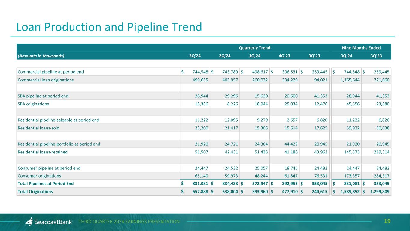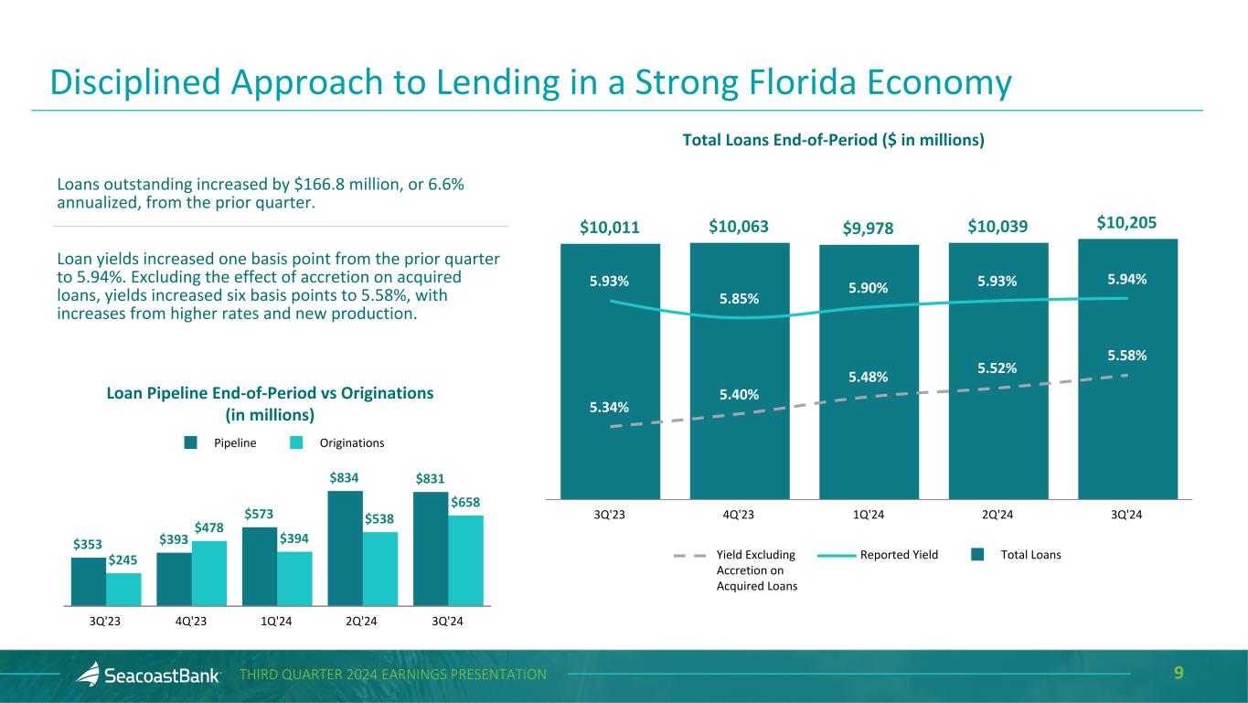 •Loans increased $166.8 million, or 6.6% annualized, totaling $10.2 billion as of September 30, 2024. Loan originations increased 22% to $657.9 million in the third quarter of 2024, compared to $538.0 million in the second quarter of 2024. The Company continues to exercise a disciplined approach to lending and is benefiting from the investments made in recent years to attract talent from large regional banks across its markets. This talent is onboarding significant new relationships, resulting in increased loan production.