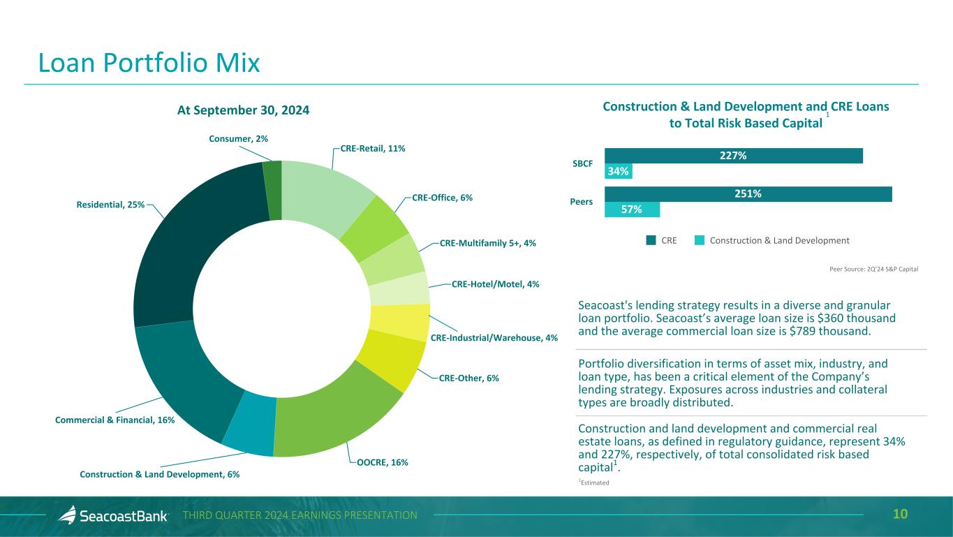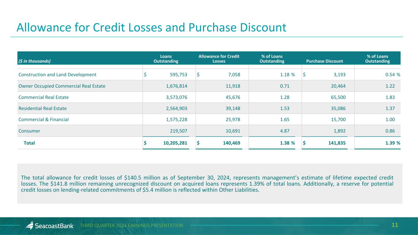 10THIRD QUARTER 2024 EARNINGS PRESENTATION At September 30, 2024 Loan Portfolio Mix Seacoast's lending strategy results in a diverse and granular loan portfolio. Seacoast’s average loan size is $360 thousand and the average commercial loan size is $789 thousand. Portfolio diversification in terms of asset mix, industry, and loan type, has been a critical element of the Company’s lending strategy. Exposures across industries and collateral types are broadly distributed. Construction and land development and commercial real estate loans, as defined in regulatory guidance, represent 34% and 227%, respectively, of total consolidated risk based capital1. CRE-Retail, 11% CRE-Office, 6% CRE-Multifamily 5+, 4% CRE-Hotel/Motel, 4% CRE-Industrial/Warehouse, 4% CRE-Other, 6% OOCRE, 16% Construction & Land Development, 6% Commercial & Financial, 16% Residential, 25% Consumer, 2% Construction & Land Development and CRE Loans to Total Risk Based Capital 227% 251% 34% 57% CRE Construction & Land Development SBCF Peers Peer Source: 2Q’24 S&P Capital 1Estimated 1