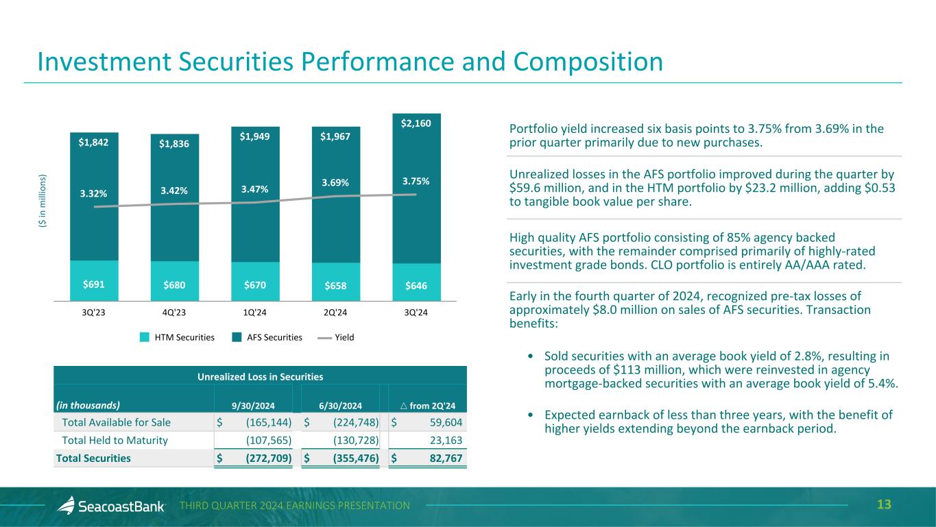 In October 2024, Seacoast repositioned a portion of its available for sale ("AFS") securities portfolio. The company sold securities with an average book yield of 2.8%, resulting in a pre-tax loss of approximately $8.0 million. The proceeds, approximately $113 million, were reinvested in agency mortgage-backed securities with an average book yield of 5.4%, for an estimated earnback of less than 3 years.