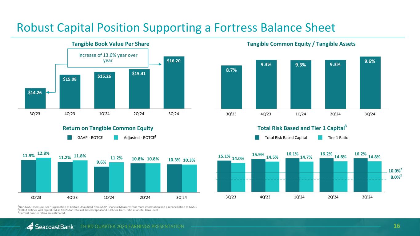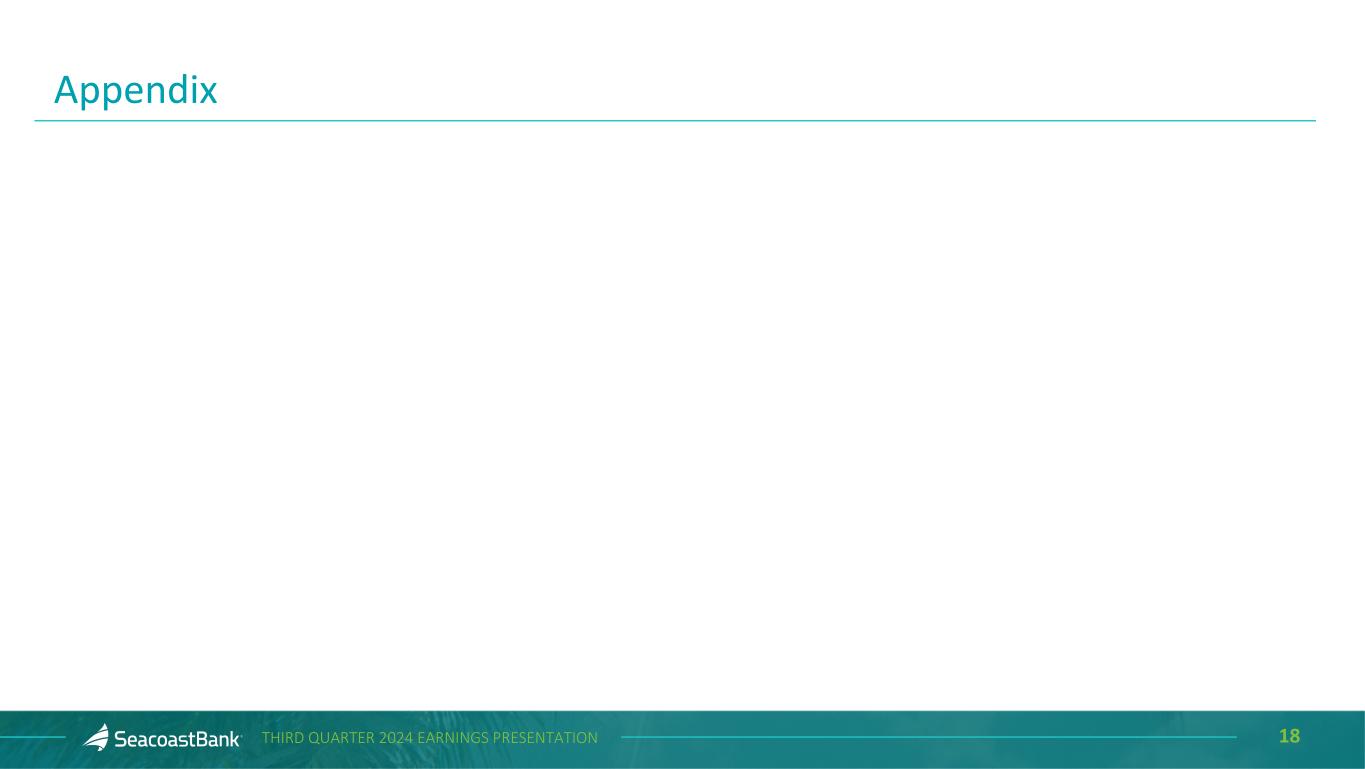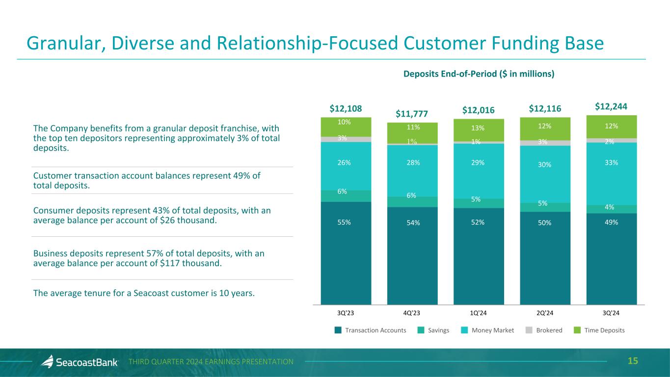 15THIRD QUARTER 2024 EARNINGS PRESENTATION Deposits End-of-Period ($ in millions) $12,108 $11,777 $12,016 $12,116 $12,244 Transaction Accounts Savings Money Market Brokered Time Deposits 3Q'23 4Q'23 1Q'24 2Q'24 3Q'24 Granular, Diverse and Relationship-Focused Customer Funding Base The Company benefits from a granular deposit franchise, with the top ten depositors representing approximately 3% of total deposits. Customer transaction account balances represent 49% of total deposits. Consumer deposits represent 43% of total deposits, with an average balance per account of $26 thousand. Business deposits represent 57% of total deposits, with an average balance per account of $117 thousand. The average tenure for a Seacoast customer is 10 years. 49%50%52%54%55% 4%5%5%6%6% 26% 28% 29% 30% 33% 3% 1% 1% 3% 2% 10% 11% 13% 12% 12%