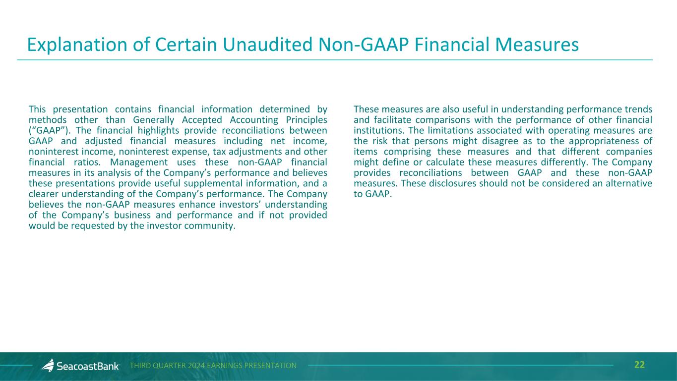 22THIRD QUARTER 2024 EARNINGS PRESENTATION This presentation contains financial information determined by methods other than Generally Accepted Accounting Principles (“GAAP”). The financial highlights provide reconciliations between GAAP and adjusted financial measures including net income, noninterest income, noninterest expense, tax adjustments and other financial ratios. Management uses these non-GAAP financial measures in its analysis of the Company’s performance and believes these presentations provide useful supplemental information, and a clearer understanding of the Company’s performance. The Company believes the non-GAAP measures enhance investors’ understanding of the Company’s business and performance and if not provided would be requested by the investor community. These measures are also useful in understanding performance trends and facilitate comparisons with the performance of other financial institutions. The limitations associated with operating measures are the risk that persons might disagree as to the appropriateness of items comprising these measures and that different companies might define or calculate these measures differently. The Company provides reconciliations between GAAP and these non-GAAP measures. These disclosures should not be considered an alternative to GAAP. Explanation of Certain Unaudited Non-GAAP Financial Measures