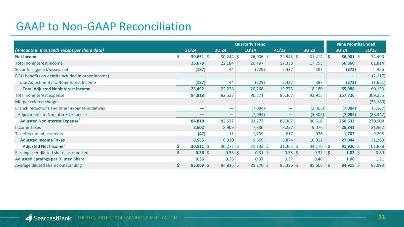 23THIRD QUARTER 2024 EARNINGS PRESENTATION Quarterly Trend Nine Months Ended (Amounts in thousands except per share data) 3Q'24 2Q'24 1Q'24 4Q'23 3Q'23 3Q'24 3Q'23 Net Income $ 30,651 $ 30,244 $ 26,006 $ 29,543 $ 31,414 $ 86,901 $ 74,490 Total noninterest income 23,679 22,184 20,497 17,338 17,793 66,360 61,814 Securities (gains)/losses, net (187) 44 (229) 2,437 387 (372) 456 BOLI benefits on death (included in other income) — — — — — — (2,117) Total Adjustments to Noninterest Income (187) 44 (229) 2,437 387 (372) (1,661) Total Adjusted Noninterest Income 23,492 22,228 20,268 19,775 18,180 65,988 60,153 Total noninterest expense 84,818 82,537 90,371 86,367 93,915 257,726 309,255 Merger related charges — — — — — — (33,180) Branch reductions and other expense initiatives — — (7,094) — (3,305) (7,094) (5,167) Adjustments to Noninterest Expense — — (7,094) — (3,305) (7,094) (38,347) Adjusted Noninterest Expense1 84,818 82,537 83,277 86,367 90,610 250,632 270,908 Income Taxes 8,602 8,909 7,830 8,257 9,076 25,341 21,962 Tax effect of adjustments (47) 11 1,739 617 936 1,703 9,298 Adjusted Income Taxes 8,555 8,920 9,569 8,874 10,012 27,044 31,260 Adjusted Net Income1 $ 30,511 $ 30,277 $ 31,132 $ 31,363 $ 34,170 $ 91,920 $ 101,878 Earnings per diluted share, as reported $ 0.36 $ 0.36 $ 0.31 $ 0.35 $ 0.37 $ 1.02 $ 0.89 Adjusted Earnings per Diluted Share 0.36 0.36 0.37 0.37 0.40 1.08 1.21 Average diluted shares outstanding $ 85,069 $ 84,816 $ 85,270 $ 85,336 $ 85,666 $ 84,915 $ 83,993 GAAP to Non-GAAP Reconciliation