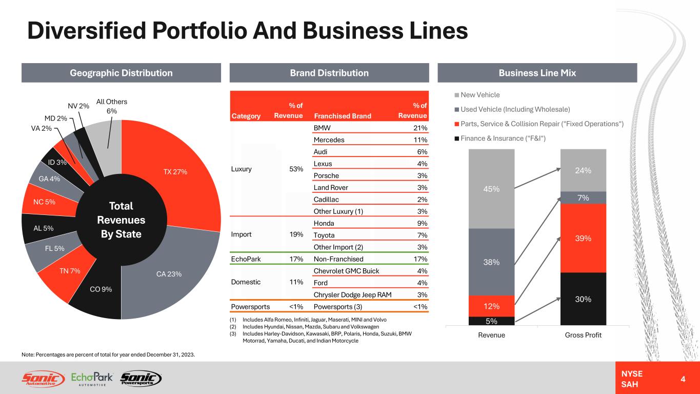 NYSE SAH Forward-Looking Statements This presentation contains “forward-looking statements” within the meaning of the Private Securities Litigation Reform Act of 1995. These statements relate to future events, are not historical facts and are based on our current expectations and assumptions regarding our business, the economy and other future conditions. These statements can generally be identified by lead-in words such as “may,” “will,” “should,” “could,” “believe,” “expect,” “estimate,” “anticipate,” “intend,” “plan,” “project,” “foresee” and other similar words or phrases. Statements that describe our Company’s objectives, plans or goals are also forward-looking statements. Examples of such forward-looking information we may be discussing in this presentation include, without limitation, our anticipated future new vehicle unit sales volume, revenues and profitability (including per unit data), our anticipated future used vehicle unit sales volume, revenues and profitability (including per unit data), future levels of consumer demand for new and used vehicles, our anticipated future parts, service and collision repair (“Fixed Operations”) gross profit, our anticipated future finance and insurance (“F&I”) gross profit, our anticipated expense reductions, targeted increases to our technician headcount, long-term annual revenue and profitability targets, anticipated future growth capital expenditures, profitability and pricing expectations in our EchoPark Segment, EchoPark’s omnichannel strategy, anticipated future EchoPark population coverage, anticipated future EchoPark revenue and unit sales volume, anticipated future performance and growth of our Franchised Dealerships Segment, anticipated growth and profitability of our Powersports Segment, anticipated liquidity positions, anticipated industry new vehicle sales volume, anticipated industry used vehicle supply, the implementation of growth and operating strategies, including acquisitions of dealerships and properties, anticipated future acquisition synergies, the return of capital to stockholders, anticipated future success and impacts from the implementation of our strategic initiatives, and earnings per share expectations. You are cautioned that these forward-looking statements are not guarantees of future performance, involve risks and uncertainties and actual results may differ materially from those projected in the forward-looking statements as a result of various factors. These risks and uncertainties include, without limitation, the ultimate impact on the Company of the June 2024 CDK Global cybersecurity incident, economic conditions in the markets in which we operate, supply chain disruptions and manufacturing delays, labor shortages, the impacts of inflation and fluctuations in interest rates, new and used vehicle industry sales volume, the success of our operational strategies, the rate and timing of overall economic expansion or contraction, and the risk factors described in the Company’s Annual Report on Form 10-K for the year ended December 31, 2023 and other reports and information filed with the United States Securities and Exchange Commission (the “SEC”). These forward-looking statements, risks, uncertainties and additional factors speak only as of the date of this presentation. We undertake no obligation to update any such statements, except as required under federal securities laws and the rules and regulations of the SEC. 2