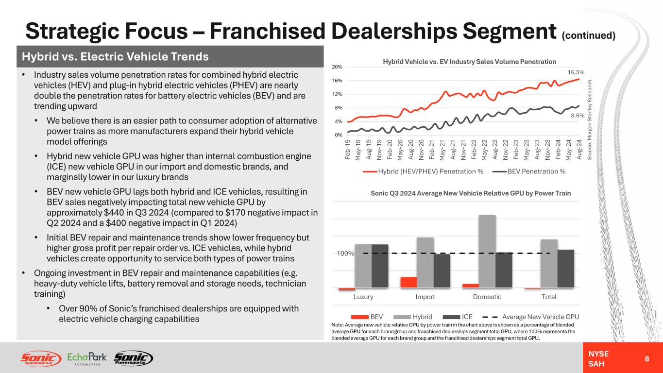Jeff Dyke, President of Sonic Automotive, commented, “I'm very proud of our team's performance in the third quarter, which not only drove record segment income in our EchoPark Segment, but also showcased our franchised dealership team's resilience in managing through operational disruptions from the CDK outage, manufacturer stop-sale orders on certain makes and models, and continued normalization of new vehicle margins. Additionally, the successful execution of another Sturgis rally by our Powersports team underscores our commitment to maintaining diverse revenue streams. Our entire company remains dedicated to delivering an outstanding guest experience and executing our long-term strategic vision. We believe that by fostering a culture of excellence and innovation, we will continue to enhance guest satisfaction and operational efficiency as we navigate the evolving automotive retail landscape.”