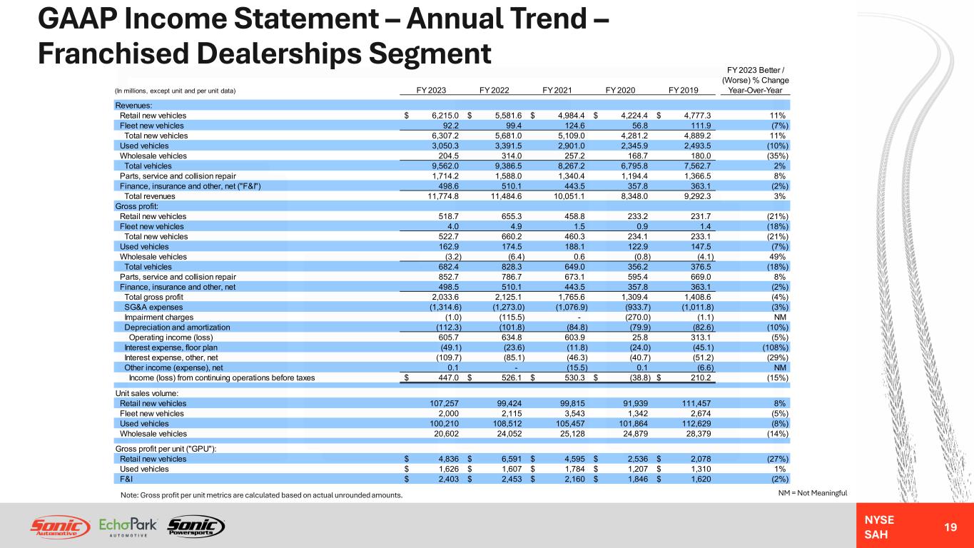 NYSE SAH GAAP Income Statement – Annual Trend – Consolidated 15 NM = Not MeaningfulNote: Earnings (loss) per share and gross profit per unit metrics are calculated based on actual unrounded amounts. FY 2023 Better / (Worse) % Change (In millions, except unit, per unit, and per share data) FY 2023 FY 2022 FY 2021 FY 2020 FY 2019 Year-Over-Year Revenues: Retail new vehicles 6,304.6$ 5,622.6$ 4,993.4$ 4,224.4$ 4,777.3$ 12% Fleet new vehicles 92.2 99.4 124.6 56.8 111.9 (7%) Total new vehicles 6,396.8 5,722.0 5,118.0 4,281.2 4,889.2 12% Used vehicles 5,213.6 5,515.4 4,933.6 3,604.2 3,490.0 (5%) Wholesale vehicles 318.8 484.9 367.2 197.4 202.8 (34%) Total vehicles 11,929.2 11,722.3 10,418.8 8,082.8 8,582.0 2% Parts, service and collision repair 1,759.5 1,599.7 1,340.4 1,194.3 1,395.3 10% Finance, insurance and other, net ("F&I") 683.7 679.1 637.2 489.9 477.0 1% Total revenues 14,372.4 14,001.1 12,396.4 9,767.0 10,454.3 3% Gross profit: Retail new vehicles 535.4 662.8 459.8 233.2 231.7 (19%) Fleet new vehicles 4.0 4.9 1.6 0.9 1.4 (18%) Total new vehicles 539.4 667.7 461.4 234.1 233.1 (19%) Used vehicles 151.2 180.8 133.0 105.2 147.4 (16%) Wholesale vehicles (2.6) (3.1) 9.6 0.1 (4.5) 16% Total vehicles 688.0 845.4 604.0 339.4 376.0 (19%) Parts, service and collision repair 874.0 792.5 673.1 594.3 668.0 10% Finance, insurance and other, net 683.7 679.1 637.2 489.9 477.0 1% Total gross profit 2,245.7 2,317.0 1,914.3 1,423.6 1,521.0 (3%) SG&A expenses (1,600.5) (1,555.1) (1,274.7) (1,028.7) (1,099.4) (3%) Impairment charges (79.3) (320.4) (0.1) (270.0) (20.8) NM Depreciation and amortization (142.3) (127.5) (101.1) (91.0) (93.1) (12%) Operating income (loss) 423.6 314.0 538.4 33.9 307.7 35% Interest expense, floor plan (67.2) (34.3) (16.7) (27.2) (48.5) (96%) Interest expense, other, net (114.6) (89.9) (48.0) (41.6) (53.0) (27%) Other income (expense), net 0.1 0.2 (15.5) 0.1 (6.6) NM Income (loss) from continuing operations before taxes 241.9 190.0 458.2 (34.8) 199.6 27% Income tax benefit (expense) (63.7) (101.5) (109.3) (15.9) (55.1) 37% Net income (loss) from continuing operations 178.2$ 88.5$ 348.9$ (50.7)$ 144.5$ 101% Diluted weighted-average shares outstanding 35.9 39.7 43.3 42.5 43.7 10% Diluted earnings (loss) per share from continuing operations 4.97$ 2.23$ 8.06$ (1.21)$ 3.30$ 123% Unit sales volume: Retail new vehicles 112,110 101,168 99,943 91,939 111,457 11% Fleet new vehicles 2,000 2,115 3,543 1,342 2,674 (5%) Used vehicles 176,147 173,209 183,292 159,025 162,149 2% Wholesale vehicles 32,330 35,323 36,795 32,057 34,153 (8%) Gross profit per unit ("GPU"): Retail new vehicles 4,776$ 6,552$ 4,600$ 2,536$ 2,078$ (27%) Used vehicles 859$ 1,043$ 720$ 667$ 909$ (18%) F&I 2,372$ 2,475$ 2,250$ 1,952$ 1,743$ (4%)