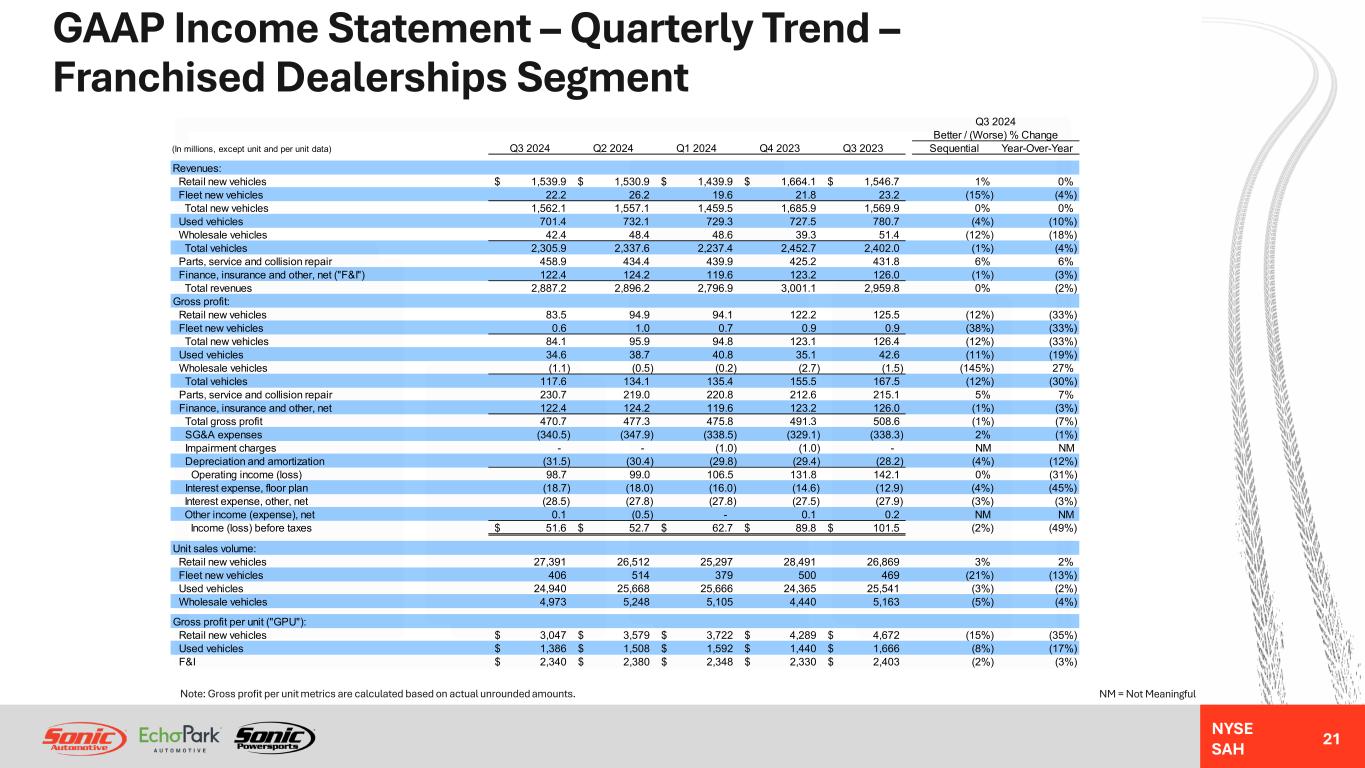NYSE SAH GAAP Income Statement – Quarterly Trend – Consolidated 17 NM = Not MeaningfulNote: Earnings (loss) per share and gross profit per unit metrics are calculated based on actual unrounded amounts. Q3 2024 Better / (Worse) % Change (In millions, except unit, per unit, and per share data) Q3 2024 Q2 2024 Q1 2024 Q4 2023 Q3 2023 Sequential Year-Over-Year Revenues: Retail new vehicles 1,566.8$ 1,552.6$ 1,455.8$ 1,680.2$ 1,573.5$ 1% 0% Fleet new vehicles 22.2 26.2 19.6 21.8 23.2 (15%) (4%) Total new vehicles 1,589.0 1,578.8 1,475.4 1,702.0 1,596.7 1% 0% Used vehicles 1,180.7 1,186.2 1,215.6 1,222.4 1,340.4 0% (12%) Wholesale vehicles 67.2 71.3 77.3 62.6 79.3 (6%) (15%) Total vehicles 2,836.9 2,836.3 2,768.3 2,987.0 3,016.4 0% (6%) Parts, service and collision repair 479.0 444.1 446.7 431.9 453.4 8% 6% Finance, insurance and other, net ("F&I") 175.6 172.6 169.0 166.0 173.7 2% 1% Total revenues 3,491.5 3,453.0 3,384.0 3,584.9 3,643.5 1% (4%) Gross profit: Retail new vehicles 87.6 97.8 96.4 124.5 131.4 (10%) (33%) Fleet new vehicles 0.6 1.0 0.7 0.9 0.9 (38%) (33%) Total new vehicles 88.2 98.8 97.1 125.4 132.3 (11%) (33%) Used vehicles 41.2 44.7 47.0 37.5 52.3 (8%) (21%) Wholesale vehicles (1.3) (0.6) (0.8) (3.2) (1.4) (111%) 7% Total vehicles 128.1 142.9 143.3 159.7 183.2 (10%) (30%) Parts, service and collision repair 239.9 223.6 223.9 215.4 225.3 7% 6% Finance, insurance and other, net 175.6 172.6 169.0 166.0 173.7 2% 1% Total gross profit 543.6 539.1 536.2 541.1 582.2 1% (7%) SG&A expenses (392.1) (393.0) (392.2) (386.3) (409.6) 0% 4% Impairment charges - (1.4) (1.0) (16.7) - NM NM Depreciation and amortization (37.9) (37.0) (36.3) (36.6) (35.2) (3%) (8%) Operating income (loss) 113.6 107.7 106.7 101.5 137.4 5% (17%) Interest expense, floor plan (23.0) (22.2) (20.3) (18.4) (17.4) (4%) (32%) Interest expense, other, net (29.8) (29.3) (29.0) (28.3) (29.0) (2%) (3%) Other income (expense), net - (0.5) 0.1 (0.1) 0.2 NM NM Income (loss) before taxes 60.8 55.7 57.5 54.7 91.2 9% (33%) Income tax benefit (expense) 13.4 (14.5) (15.5) (16.0) (22.8) 193% 159% Net income (loss) 74.2$ 41.2$ 42.0$ 38.7$ 68.4$ 80% 8% Diluted weighted-average shares outstanding 34.9 34.9 34.9 34.8 35.6 0% 2% Diluted earnings (loss) per share 2.13$ 1.18$ 1.20$ 1.11$ 1.92$ 81% 11% Unit sales volume: Retail new vehicles 28,657 27,705 26,142 29,439 28,260 3% 1% Fleet new vehicles 406 514 379 500 469 (21%) (13%) Used vehicles 43,474 42,831 44,056 42,216 45,428 2% (4%) Wholesale vehicles 7,792 7,859 8,112 7,127 7,996 (1%) (3%) Gross profit per unit ("GPU"): Retail new vehicles 3,056$ 3,531$ 3,688$ 4,230$ 4,649$ (13%) (34%) Used vehicles 947$ 1,044$ 1,068$ 888$ 1,150$ (9%) (18%) F&I 2,434$ 2,447$ 2,407$ 2,317$ 2,357$ (1%) 3%