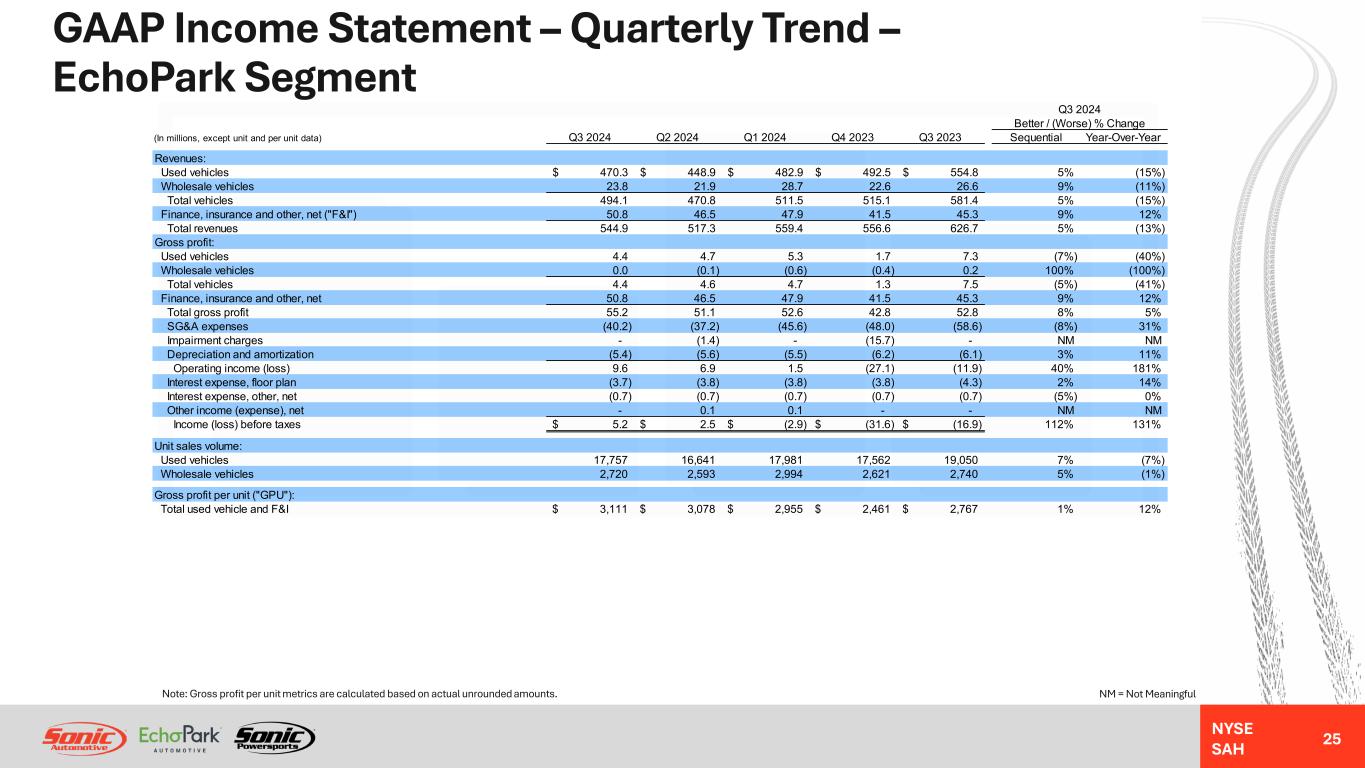 •EchoPark Segment revenues of $544.9 million, down 13% year-over-year; all-time record quarterly EchoPark Segment total gross profit of $55.2 million, up 5% year-over-year; EchoPark Segment retail used vehicle unit sales volume of 17,757, down 7% year-over-year