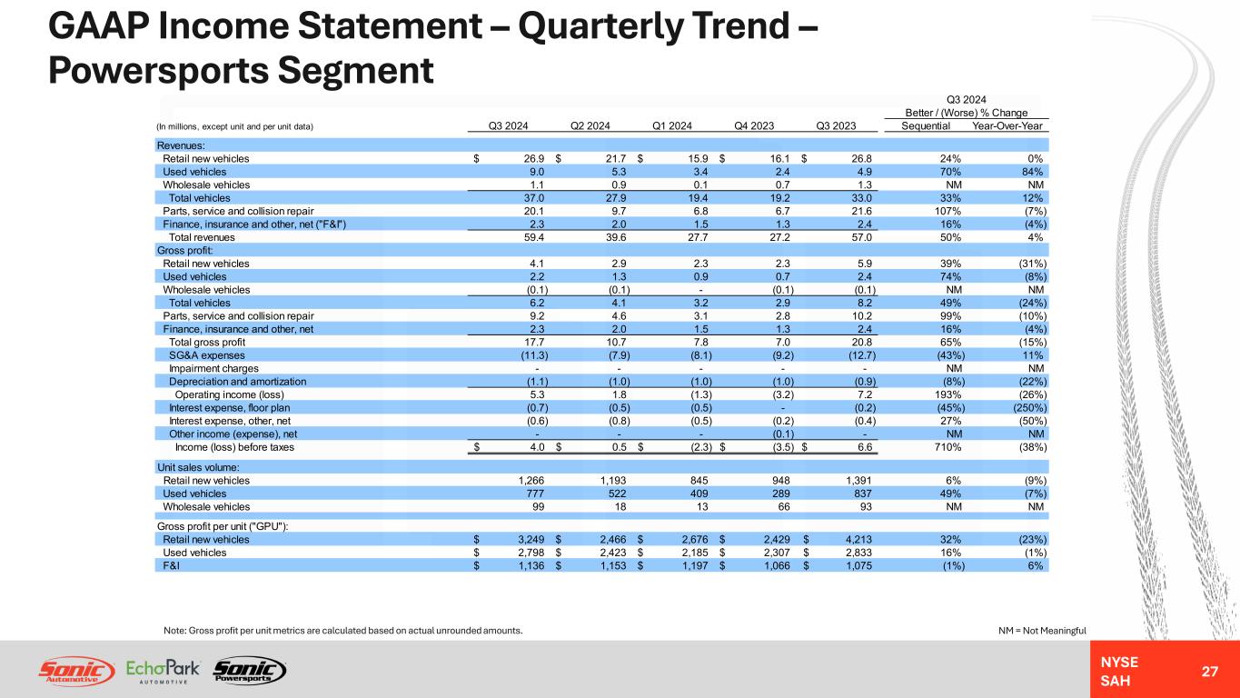 NYSE SAH GAAP Income Statement – Quarterly Trend – Powersports Segment 27 NM = Not MeaningfulNote: Gross profit per unit metrics are calculated based on actual unrounded amounts. Q3 2024 Better / (Worse) % Change (In millions, except unit and per unit data) Q3 2024 Q2 2024 Q1 2024 Q4 2023 Q3 2023 Sequential Year-Over-Year Revenues: Retail new vehicles 26.9$ 21.7$ 15.9$ 16.1$ 26.8$ 24% 0% Used vehicles 9.0 5.3 3.4 2.4 4.9 70% 84% Wholesale vehicles 1.1 0.9 0.1 0.7 1.3 NM NM Total vehicles 37.0 27.9 19.4 19.2 33.0 33% 12% Parts, service and collision repair 20.1 9.7 6.8 6.7 21.6 107% (7%) Finance, insurance and other, net ("F&I") 2.3 2.0 1.5 1.3 2.4 16% (4%) Total revenues 59.4 39.6 27.7 27.2 57.0 50% 4% Gross profit: Retail new vehicles 4.1 2.9 2.3 2.3 5.9 39% (31%) Used vehicles 2.2 1.3 0.9 0.7 2.4 74% (8%) Wholesale vehicles (0.1) (0.1) - (0.1) (0.1) NM NM Total vehicles 6.2 4.1 3.2 2.9 8.2 49% (24%) Parts, service and collision repair 9.2 4.6 3.1 2.8 10.2 99% (10%) Finance, insurance and other, net 2.3 2.0 1.5 1.3 2.4 16% (4%) Total gross profit 17.7 10.7 7.8 7.0 20.8 65% (15%) SG&A expenses (11.3) (7.9) (8.1) (9.2) (12.7) (43%) 11% Impairment charges - - - - - NM NM Depreciation and amortization (1.1) (1.0) (1.0) (1.0) (0.9) (8%) (22%) Operating income (loss) 5.3 1.8 (1.3) (3.2) 7.2 193% (26%) Interest expense, floor plan (0.7) (0.5) (0.5) - (0.2) (45%) (250%) Interest expense, other, net (0.6) (0.8) (0.5) (0.2) (0.4) 27% (50%) Other income (expense), net - - - (0.1) - NM NM Income (loss) before taxes 4.0$ 0.5$ (2.3)$ (3.5)$ 6.6$ 710% (38%) Unit sales volume: Retail new vehicles 1,266 1,193 845 948 1,391 6% (9%) Used vehicles 777 522 409 289 837 49% (7%) Wholesale vehicles 99 18 13 66 93 NM NM Gross profit per unit ("GPU"): Retail new vehicles 3,249$ 2,466$ 2,676$ 2,429$ 4,213$ 32% (23%) Used vehicles 2,798$ 2,423$ 2,185$ 2,307$ 2,833$ 16% (1%) F&I 1,136$ 1,153$ 1,197$ 1,066$ 1,075$ (1%) 6%