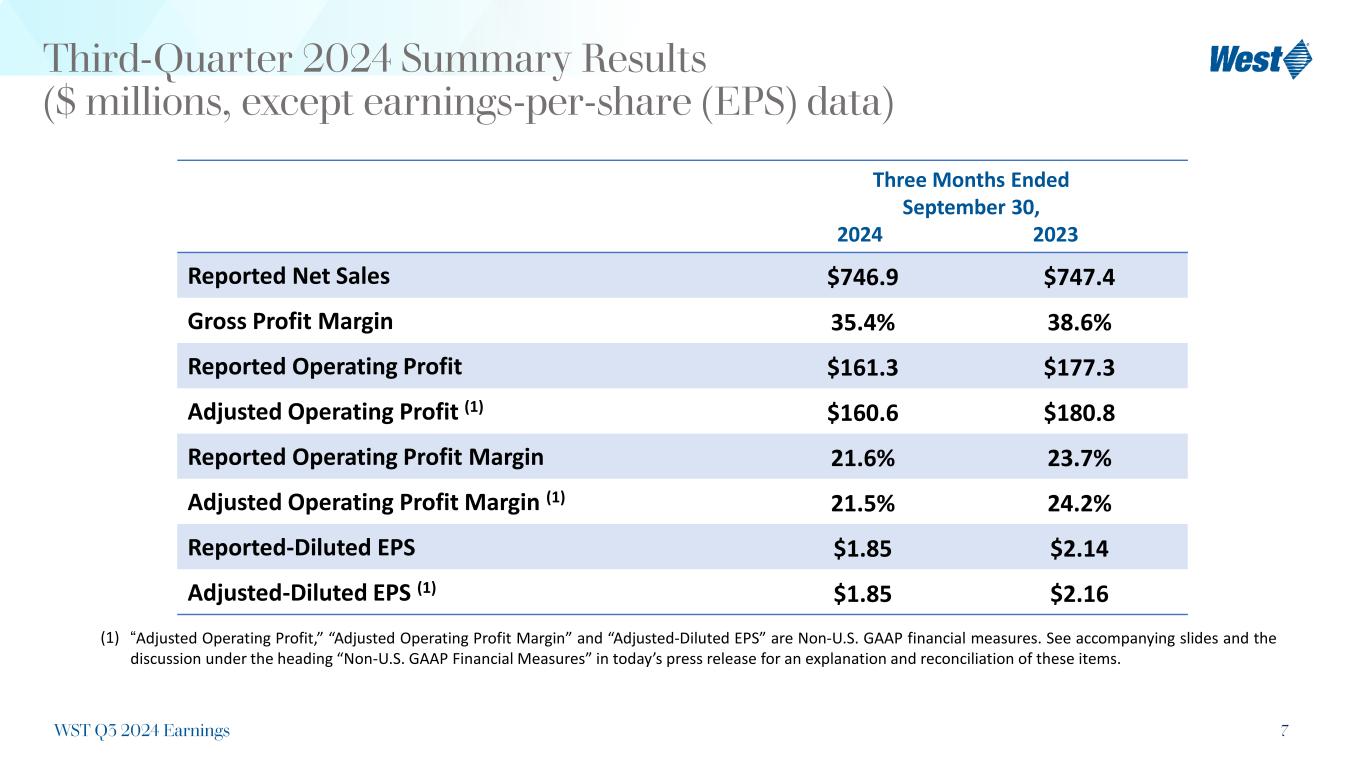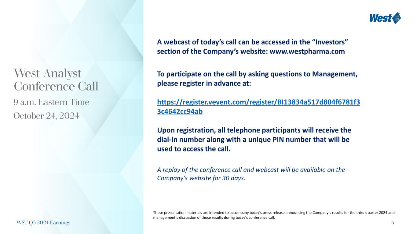 1 Third-Quarter 2024 Third Quarter Overall Net Sales $746.9M | 0.1% Diluted Earnings Per Share: $1.85 Adjusted Diluted Earnings Per Share: $1.85 Eric M. Green President and Chief Executive Officer Chair of the Board West Pharmaceutical Services, Inc. WST Q3 2024 Earnings Cautionary Statement Under the Private Securities Litigation Reform Act of 1995 This presentation and any accompanying management commentary contain “forward-looking statements” as that term is defined in the Private Securities Litigation Reform Act of 1995. Such statements include, but are not limited to, statements about product development and operational performance. Each of these statements is based on preliminary information, and actual results could differ from any preliminary estimates. We caution investors that the risk factors listed under “Cautionary Statement” in our press releases, as well as those set forth under the caption "Risk Factors" in our most recent Annual Report on Form 10-K as filed with the Securities and Exchange Commission and as revised or supplemented by our quarterly reports on Form 10-Q, could cause our actual results to differ materially from those estimated or predicted in the forward-looking statements. You should evaluate any statement in light of these important factors. Except as required by law or regulation, we undertake no obligation to publicly update any forward-looking statements, whether as a result of new information, future events or otherwise, therefore you should not rely on these forward-looking statements as representing our views as of any date other than today. Non-U.S. GAAP Financial Measures Certain financial measures included in these presentation materials, or which may be referred to in management’s discussion of the Company’s results and outlook, have not been calculated in accordance with U.S. generally accepted accounting principles (“U.S. GAAP”), and therefore are referred to as non- U.S. GAAP financial measures. Non-U.S. GAAP financial measures should not be considered in isolation or as an alternative to such measures determined in accordance with U.S. GAAP. Please refer to “Reconciliation of Non-U.S. GAAP Financial Measures” at the end of these materials for more information. “We are pleased to report solid third quarter results. Our West team across the globe continues to execute at a high-level, motivated by our purpose of improving patient lives. A key aspect of our strategy is West’s team of scientific thought leaders and technical experts who continue to drive strong partnership and close collaboration with our customers. This reinforces my confidence in West’s execution capabilities, as we continue to deliver our proven market-led strategy and attractive long-term potential.”