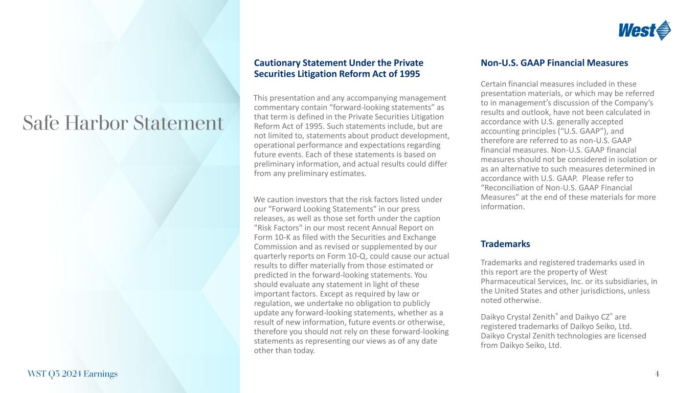3 West Analyst Conference Call 9 a.m. Eastern Time October 24, 2024 A webcast of today’s call can be accessed in the “Investors” section of the Company’s website: www.westpharma.com To participate on the call by asking questions to Management, please register in advance at: https://register.vevent.com/register/BI13834a517d804f6781f3 3c4642cc94ab Upon registration, all telephone participants will receive the dial-in number along with a unique PIN number that will be used to access the call. A replay of the conference call and webcast will be available on the Company’s website for 30 days. These presentation materials are intended to accompany today’s press release announcing the Company’s results for the third quarter 2024 and management’s discussion of those results during today’s conference call. WST Q3 2024 Earnings