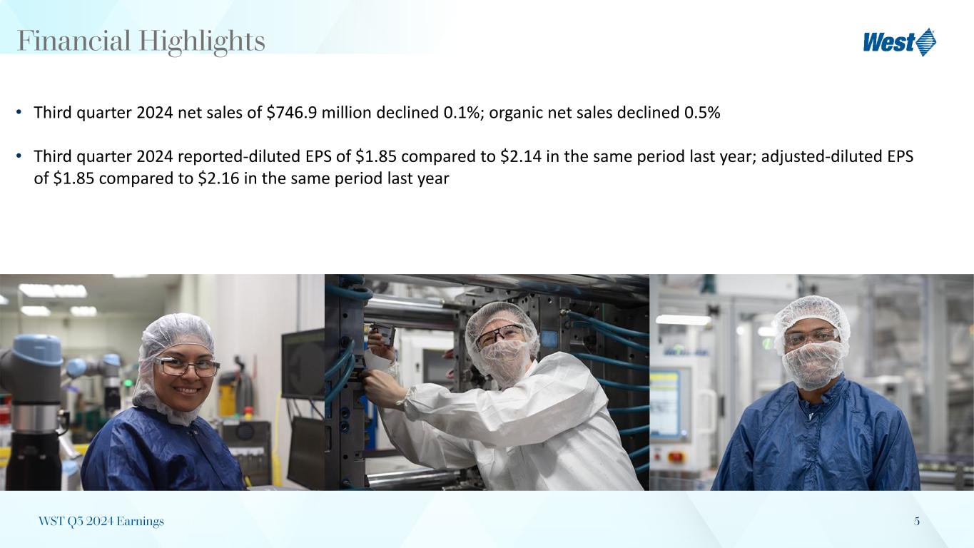 4 Safe Harbor Statement This presentation and any accompanying management commentary contain “forward-looking statements” as that term is defined in the Private Securities Litigation Reform Act of 1995. Such statements include, but are not limited to, statements about product development, operational performance and expectations regarding future events. Each of these statements is based on preliminary information, and actual results could differ from any preliminary estimates. We caution investors that the risk factors listed under our “Forward Looking Statements” in our press releases, as well as those set forth under the caption "Risk Factors" in our most recent Annual Report on Form 10-K as filed with the Securities and Exchange Commission and as revised or supplemented by our quarterly reports on Form 10-Q, could cause our actual results to differ materially from those estimated or predicted in the forward-looking statements. You should evaluate any statement in light of these important factors. Except as required by law or regulation, we undertake no obligation to publicly update any forward-looking statements, whether as a result of new information, future events or otherwise, therefore you should not rely on these forward-looking statements as representing our views as of any date other than today. Certain financial measures included in these presentation materials, or which may be referred to in management’s discussion of the Company’s results and outlook, have not been calculated in accordance with U.S. generally accepted accounting principles (“U.S. GAAP”), and therefore are referred to as non-U.S. GAAP financial measures. Non-U.S. GAAP financial measures should not be considered in isolation or as an alternative to such measures determined in accordance with U.S. GAAP. Please refer to “Reconciliation of Non-U.S. GAAP Financial Measures” at the end of these materials for more information. Cautionary Statement Under the Private Securities Litigation Reform Act of 1995 Non-U.S. GAAP Financial Measures Trademarks and registered trademarks used in this report are the property of West Pharmaceutical Services, Inc. or its subsidiaries, in the United States and other jurisdictions, unless noted otherwise. Daikyo Crystal Zenith® and Daikyo CZ® are registered trademarks of Daikyo Seiko, Ltd. Daikyo Crystal Zenith technologies are licensed from Daikyo Seiko, Ltd. Trademarks WST Q3 2024 Earnings