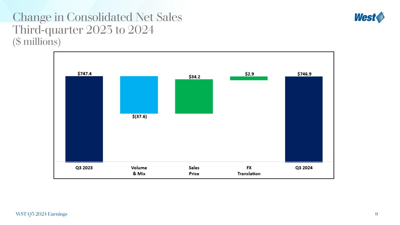 Eric M. Green, President, Chief Executive Officer and Chair of the Board commented; “We are pleased to report solid third quarter results. Our West team across the globe continues to execute at a high-level, motivated by our purpose of improving patient lives. A key aspect of our strategy is West’s team of scientific thought leaders and technical experts who continue to drive strong partnership and close collaboration with our customers. This reinforces my confidence in West’s execution capabilities, as we continue to deliver our proven market-led strategy and attractive long-term potential.”