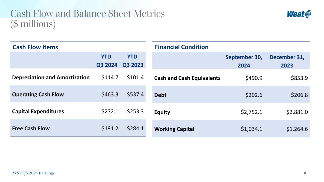 10 Gross Profit Update ($ millions) Three Months Ended September 30, 2024 2023 Proprietary Products Gross Profit $235.7 $261.4 Proprietary Products Gross Profit Margin 39.2% 43.4% Contract-Manufactured Products Gross Profit $29.0 $26.9 Contract-Manufactured Products Gross Profit Margin 19.9% 18.6% Consolidated Gross Profit $264.7 $288.3 Consolidated Gross Profit Margin 35.4% 38.6% WST Q3 2024 Earnings