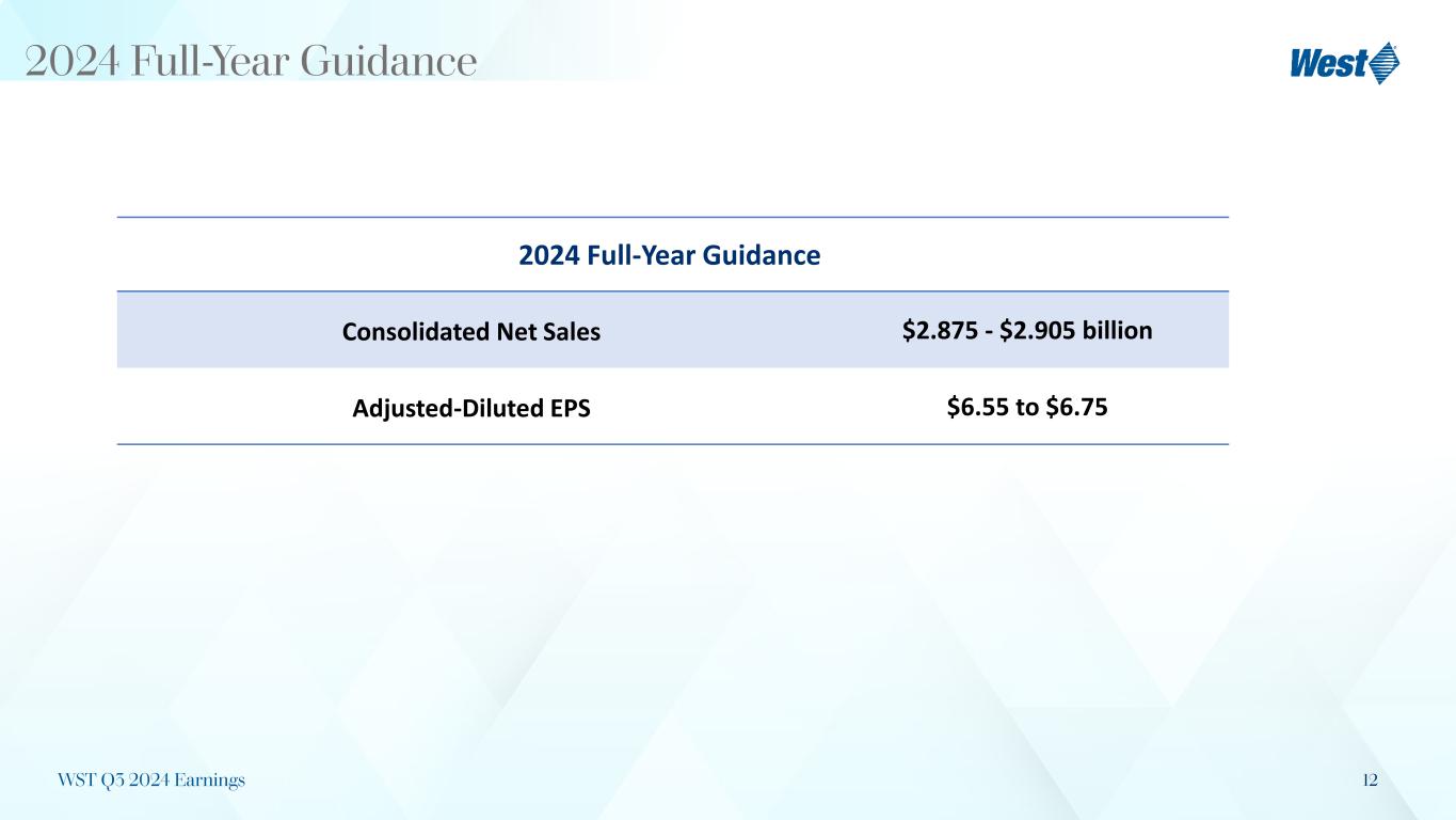 12 2024 Full-Year Guidance WST Q3 2024 Earnings 2024 Full-Year Guidance Consolidated Net Sales $2.875 - $2.905 billion Adjusted-Diluted EPS $6.55 to $6.75