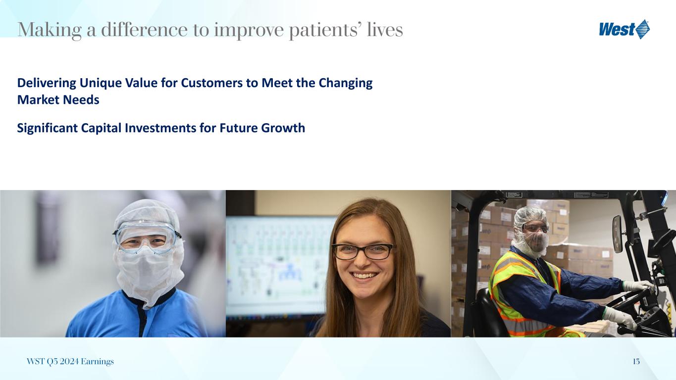 14 Eric M. Green President & Chief Executive Officer, Chair of the Board Bernard J. Birkett Senior VP & Chief Financial Officer John Sweeney VP, Investor Relations Q & A WST Q3 2024 Earnings