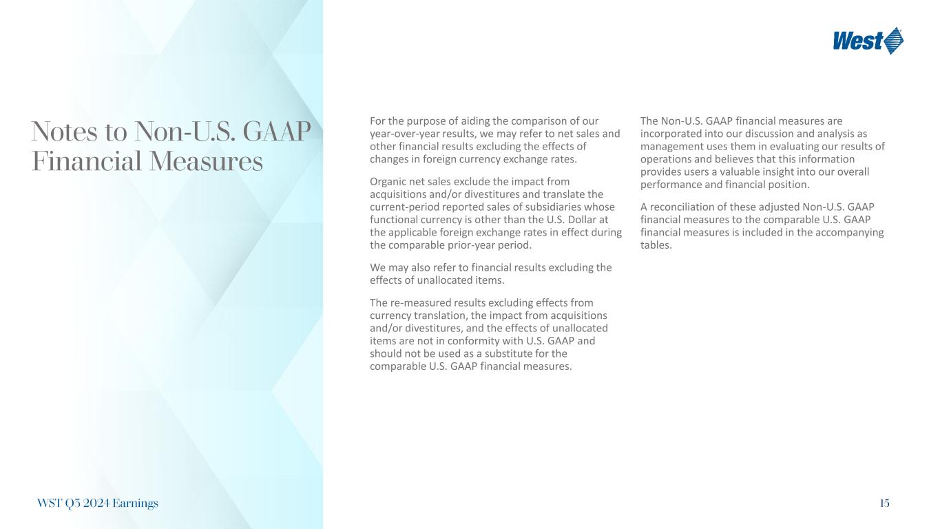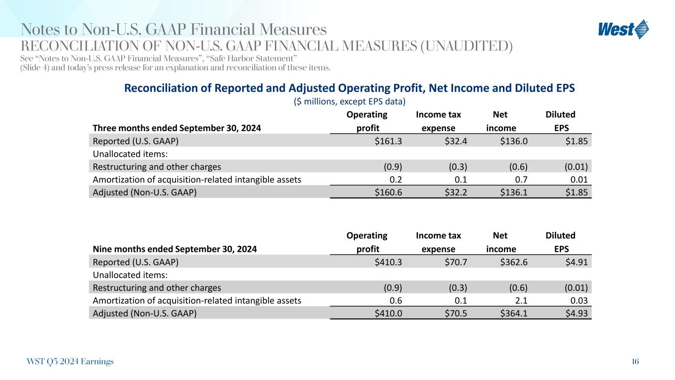 15 Notes to Non-U.S. GAAP Financial Measures The Non-U.S. GAAP financial measures are incorporated into our discussion and analysis as management uses them in evaluating our results of operations and believes that this information provides users a valuable insight into our overall performance and financial position. A reconciliation of these adjusted Non-U.S. GAAP financial measures to the comparable U.S. GAAP financial measures is included in the accompanying tables. For the purpose of aiding the comparison of our year-over-year results, we may refer to net sales and other financial results excluding the effects of changes in foreign currency exchange rates. Organic net sales exclude the impact from acquisitions and/or divestitures and translate the current-period reported sales of subsidiaries whose functional currency is other than the U.S. Dollar at the applicable foreign exchange rates in effect during the comparable prior-year period. We may also refer to financial results excluding the effects of unallocated items. The re-measured results excluding effects from currency translation, the impact from acquisitions and/or divestitures, and the effects of unallocated items are not in conformity with U.S. GAAP and should not be used as a substitute for the comparable U.S. GAAP financial measures. WST Q3 2024 Earnings