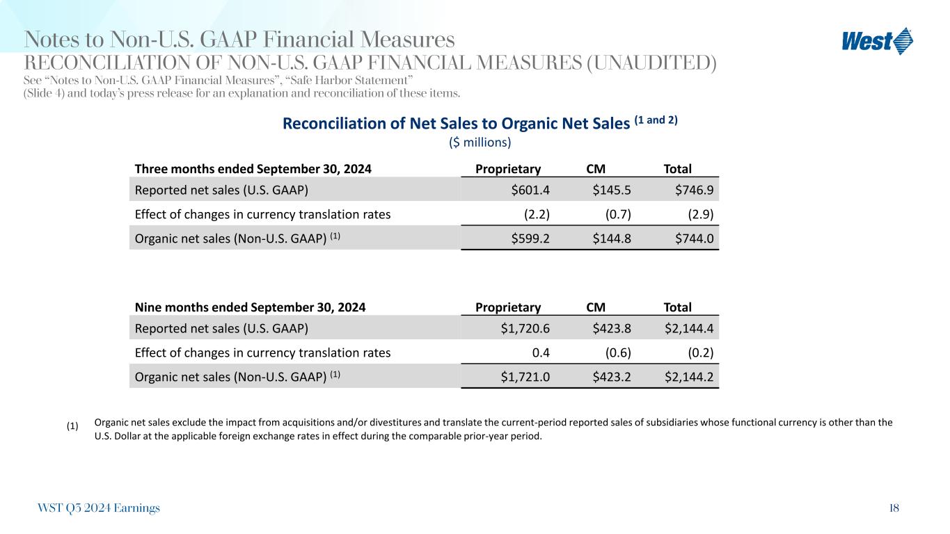 17 Notes to Non-U.S. GAAP Financial Measures RECONCILIATION OF NON-U.S. GAAP FINANCIAL MEASURES (UNAUDITED) See “Notes to Non-U.S. GAAP Financial Measures”, “Safe Harbor Statement” (Slide 4) and today’s press release for an explanation and reconciliation of these items. Reconciliation of Reported and Adjusted Operating Profit, Net Income and Diluted EPS ($ millions, except EPS data) Three months ended September 30, 2023 Operating profit Income tax expense Net income Diluted EPS Reported (U.S. GAAP) $177.3 $29.4 $161.3 $2.14 Unallocated items: Amortization of acquisition-related intangible assets 0.2 0.1 0.7 0.01 Legal settlement - (0.9) (2.9) (0.04) Cost investment impairment 3.3 - 3.3 0.05 Adjusted (Non-U.S. GAAP) $180.8 $28.6 $162.4 $2.16 Nine months ended September 30, 2023 Operating profit Income tax expense Net income Diluted EPS Reported (U.S. GAAP) $515.1 $87.8 $456.4 $6.05 Unallocated items: Restructuring and other charges 0.1 (0.3) 0.4 - Amortization of acquisition-related intangible assets 0.6 0.1 2.1 0.03 Legal settlement - (0.9) (2.9) (0.04) Cost investment impairment 3.3 - 3.3 0.05 Loss on disposal of plant 11.6 (0.7) 12.3 0.16 Adjusted (Non-U.S. GAAP) $530.7 $86.0 $471.6 $6.25 WST Q3 2024 Earnings