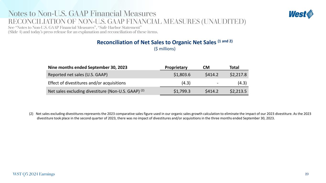18 Notes to Non-U.S. GAAP Financial Measures RECONCILIATION OF NON-U.S. GAAP FINANCIAL MEASURES (UNAUDITED) See “Notes to Non-U.S. GAAP Financial Measures”, “Safe Harbor Statement” (Slide 4) and today’s press release for an explanation and reconciliation of these items. Reconciliation of Net Sales to Organic Net Sales (1 and 2) ($ millions) Organic net sales exclude the impact from acquisitions and/or divestitures and translate the current-period reported sales of subsidiaries whose functional currency is other than the U.S. Dollar at the applicable foreign exchange rates in effect during the comparable prior-year period. (1) Three months ended September 30, 2024 Proprietary CM Total Reported net sales (U.S. GAAP) $601.4 $145.5 $746.9 Effect of changes in currency translation rates (2.2) (0.7) (2.9) Organic net sales (Non-U.S. GAAP) (1) $599.2 $144.8 $744.0 Nine months ended September 30, 2024 Proprietary CM Total Reported net sales (U.S. GAAP) $1,720.6 $423.8 $2,144.4 Effect of changes in currency translation rates 0.4 (0.6) (0.2) Organic net sales (Non-U.S. GAAP) (1) $1,721.0 $423.2 $2,144.2 WST Q3 2024 Earnings