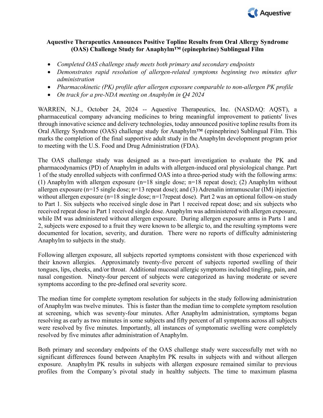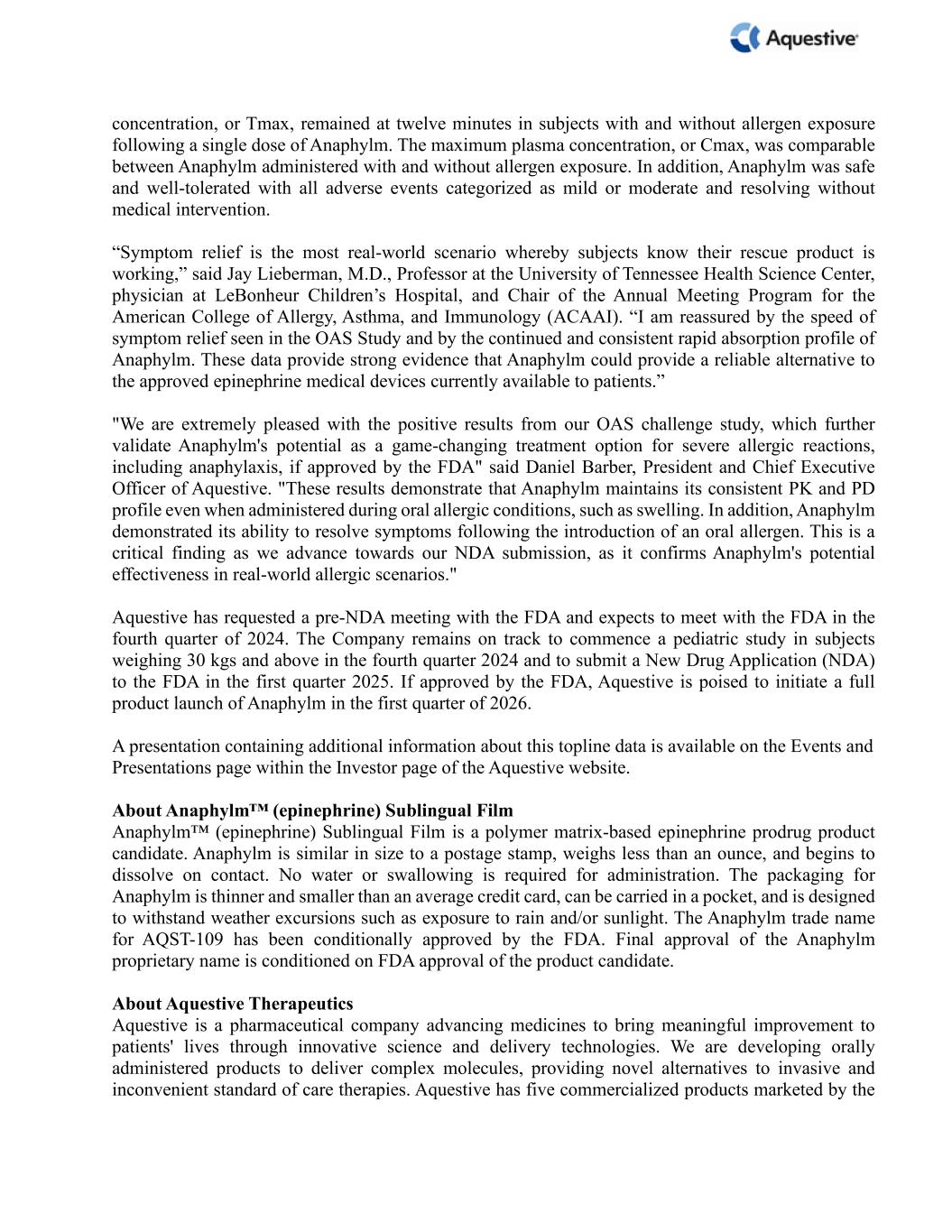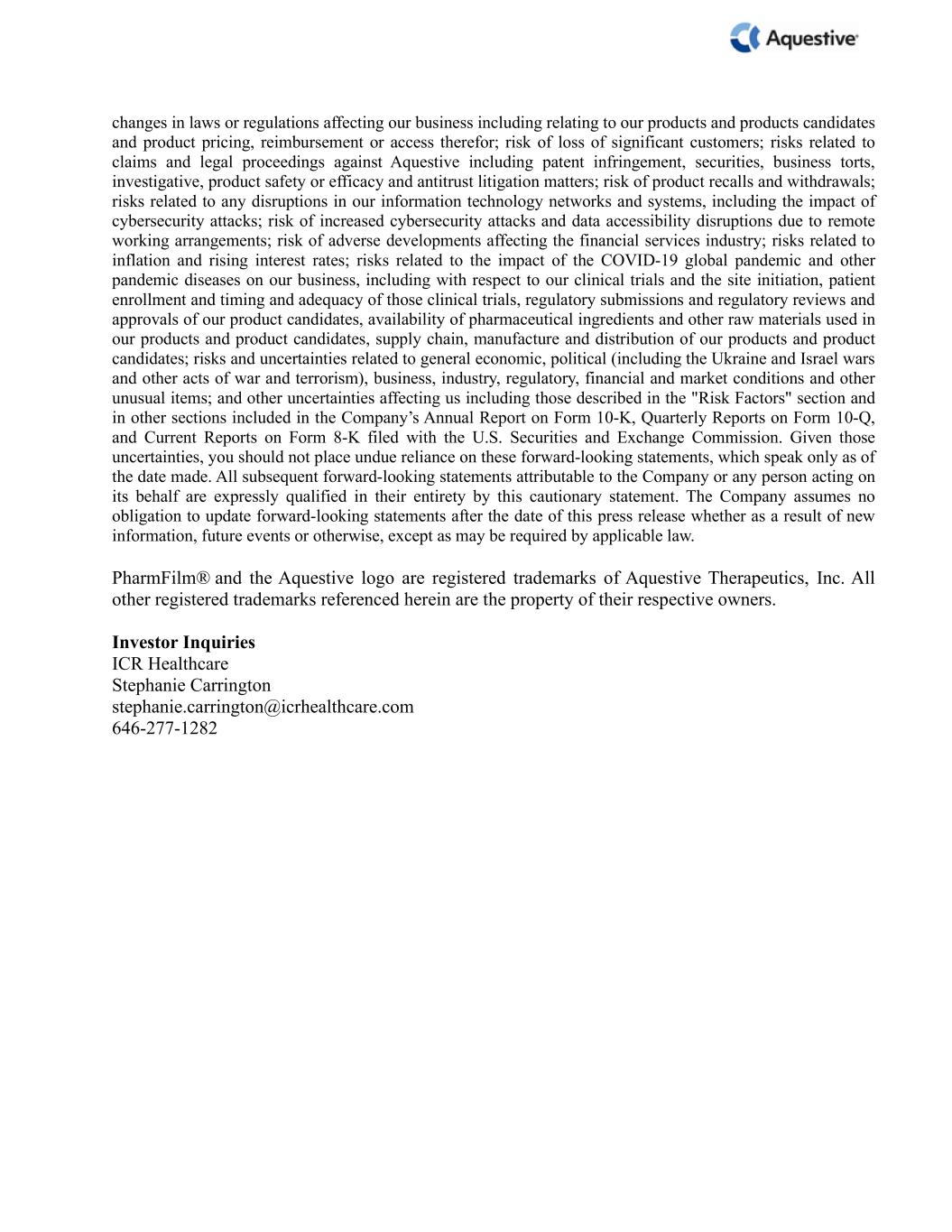 Advancing medicines. Solving problems. Improving lives. 2 ® Disclaimer Certain statements in this presentation include “forward-looking statements” within the meaning of the Private Securities Litigation Reform Act of 1995. Words such as “believe,” “anticipate,” “plan,” “expect,” “estimate,” “intend,” “may,” “will,” or the negative of those terms, and similar expressions, are intended to identify forward-looking statements. These forward-looking statements include, but are not limited to, statements regarding the advancement and related timing of our product candidate Anaphylm (epinephrine) Sublingual Film through clinical development and approval by the FDA, including the timing of submission of supporting and pediatric clinical studies, holding a pre-NDA meeting with the FDA and filing the NDA for Anaphylm with the FDA, and the following launch of Anaphylm, if approved by the FDA; that the results of the Company’s clinical studies for Anaphylm are sufficient to support submission of the NDA for approval of Anaphylm by the FDA; the potential indications and potential benefits our products and product candidates could bring to patients; and business strategies, market opportunities, and other statements that are not historical facts. These forward-looking statements are based on our current expectations and beliefs and are subject to a number of risks and uncertainties that could cause actual results to differ materially from those described in the forward-looking statements. Such risks and uncertainties include, but are not limited to, risks associated with our development work, including any delays or changes to the timing, cost and success of our product development activities and clinical trials and plans, including those relating to Anaphylm (including for pediatric patients); risk of delays in advancement of the regulatory approval process through the FDA of our product candidates, including the filing of the respective NDAs, including for Anaphylm, or the failure to receive FDA approval at all of any of these product candidates; risk of the Company’s ability to generate sufficient clinical data for approval of our product candidates, including with respect to our pharmacokinetic and pharmacodynamic comparability submission for FDA approval of Anaphylm; risk of the Company’s ability to address the FDA’s comments on the Company’s clinical trials and other concerns identified in the FDA Type C meeting minutes for Anaphylm, including the risk that the FDA may require additional clinical studies for approval of Anaphylm; risk of the success of any competing products; risks and uncertainties inherent in commercializing a new product (including technology risks, financial risks, market risks and implementation risks and regulatory limitations); risk of sufficient capital and cash resources, including sufficient access to available debt and equity financing, including under our ATM facility and the Lincoln Park Purchase Agreement, and revenues from operations, to satisfy all of our short-term and longer-term liquidity and cash requirements and other cash needs, at the times and in the amounts needed, including to fund commercialization activities relating to fund future clinical development and commercial activities for our product candidates, including Anaphylm, should these product candidates be approved by the FDA; risk of eroding market share for Suboxone® and risk as a sunsetting product, which accounts for the substantial part of our current operating revenue; risk of default of our debt instruments; risks related to the outsourcing of certain sales, marketing and other operational and staff functions to third parties; risk of the rate and degree of market acceptance in the U.S. of Anaphylm and our other product candidates, should these product candidates be approved by the FDA, and for our licensed products in the U.S. and abroad; risk of the success of any competing products including generics; risk of the size and growth of our product markets; risk of compliance with all FDA and other governmental and customer requirements for our manufacturing facilities; risks associated with intellectual property rights and infringement claims relating to our products; risk that our patent applications for our product candidates, including for Anaphylm, will not be timely issued, or issued at all, by the U.S. Patent and Trademark Office: risk of unexpected patent developments; risk of legislation and regulatory actions and changes in laws or regulations affecting our business including relating to our products and products candidates and product pricing, reimbursement or access therefor; risk of loss of significant customers; risks related to claims and legal proceedings against Aquestive including patent infringement, securities, business torts, investigative, product safety or efficacy and antitrust litigation matters; risk of product recalls and withdrawals; risks related to any disruptions in our information technology networks and systems, including the impact of cybersecurity attacks; risk of increased cybersecurity attacks and data accessibility disruptions due to remote working arrangements; risk of adverse developments affecting the financial services industry; risks related to inflation and rising interest rates; risks related to the impact of the COVID-19 global pandemic and other pandemic diseases on our business, including with respect to our clinical trials and the site initiation, patient enrollment and timing and adequacy of those clinical trials, regulatory submissions and regulatory reviews and approvals of our product candidates, availability of pharmaceutical ingredients and other raw materials used in our products and product candidates, supply chain, manufacture and distribution of our products and product candidates; risks and uncertainties related to general economic, political (including the Ukraine and Israel wars and o
