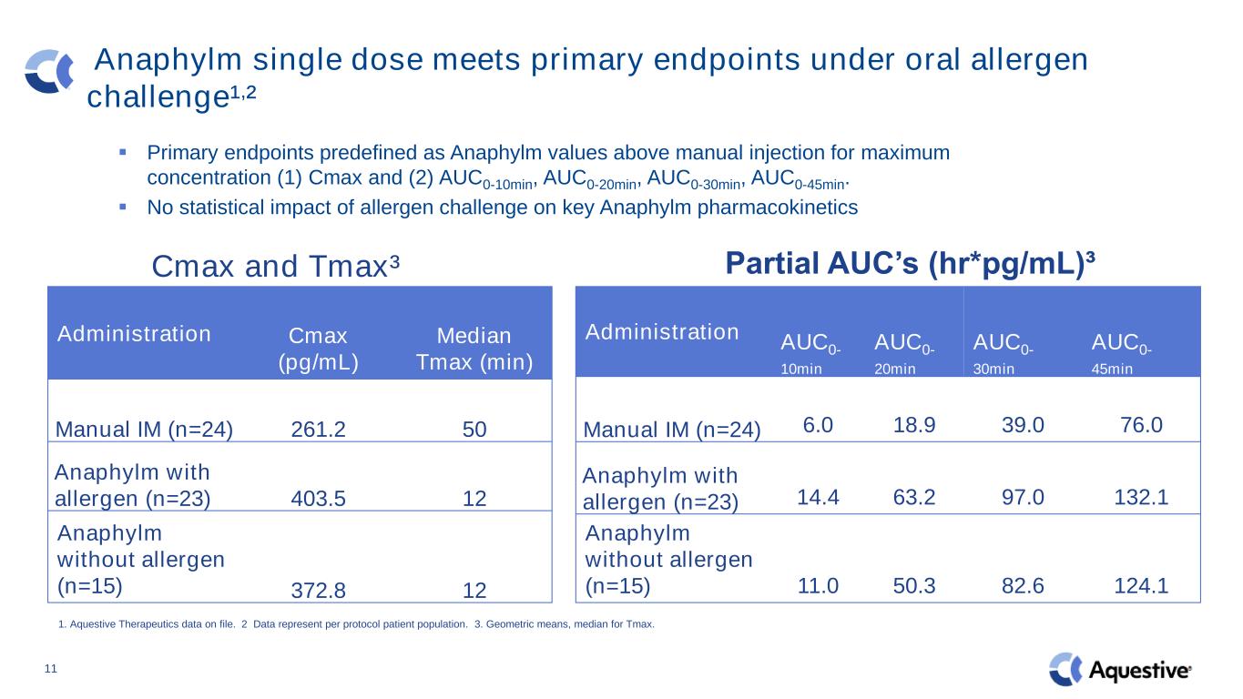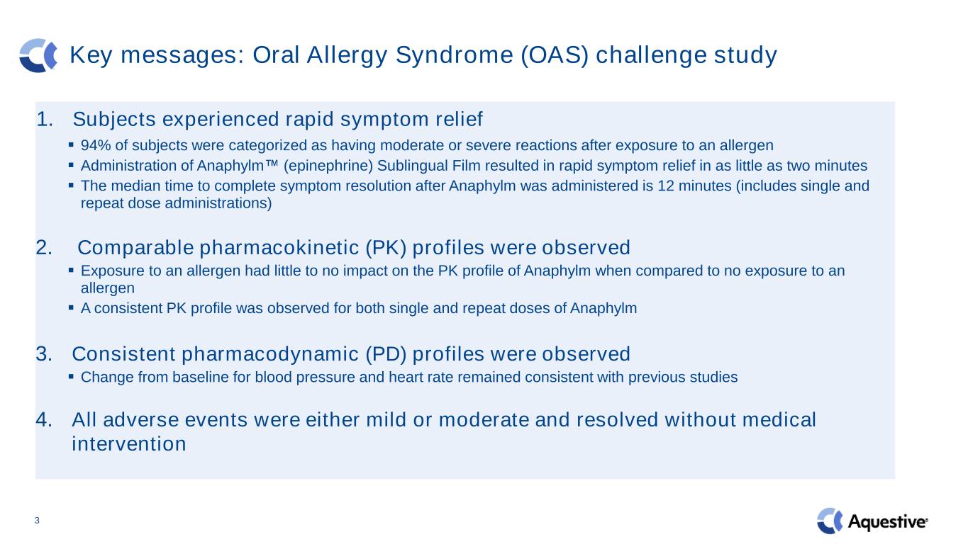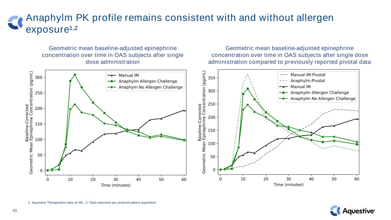 Advancing medicines. Solving problems. Improving lives. Anaphylm PK profile remains consistent with and without allergen exposure¹,² 1. Aquestive Therapeutics data on file. 2. Data represent per protocol patient population. Geometric mean baseline-adjusted epinephrine concentration over time in OAS subjects after single dose administration compared to previously reported pivotal data 10 Geometric mean baseline-adjusted epinephrine concentration over time in OAS subjects after single dose administration
