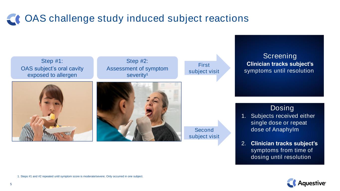 Advancing medicines. Solving problems. Improving lives. 4 OAS challenge study design Subjects with OAS (n=36) Adrenalin (IM) (no allergen) Anaphylm¹ (after allergen) Anaphylm (no allergen) Adrenalin (IM) (no allergen) Anaphylm¹ (after allergen) Anaphylm (no allergen) single dose (n=18) repeat dose (n=18) Primary endpoints: a comparison of PK after allergen exposure to the Adrenalin intramuscular (IM) injection with no allergen exposureTwo-part investigation to evaluate the pharmacokinetics (PK) and pharmacodynamics (PD) of Anaphylm in adults with allergen- induced oral physiological change Verbal Rating Scale (VRS) of subject reported symptoms (0 – resolved, 1 – resolving, 2 – no change, 3 – worsening) Pharmacokinetics/ Pharmacodynamics Clinical Study Design up to 12 subjects single or repeat (opposite of Part 1 + IM) Part 2 (with allergen) 2 -w e e k w a s h o u t 1.Volunteers with OAS were challenged by exposure to the allergen known to trigger their reaction (e.g., apple, cherry, mango, melon, kiwi, celery, banana or carrot). Part 1
