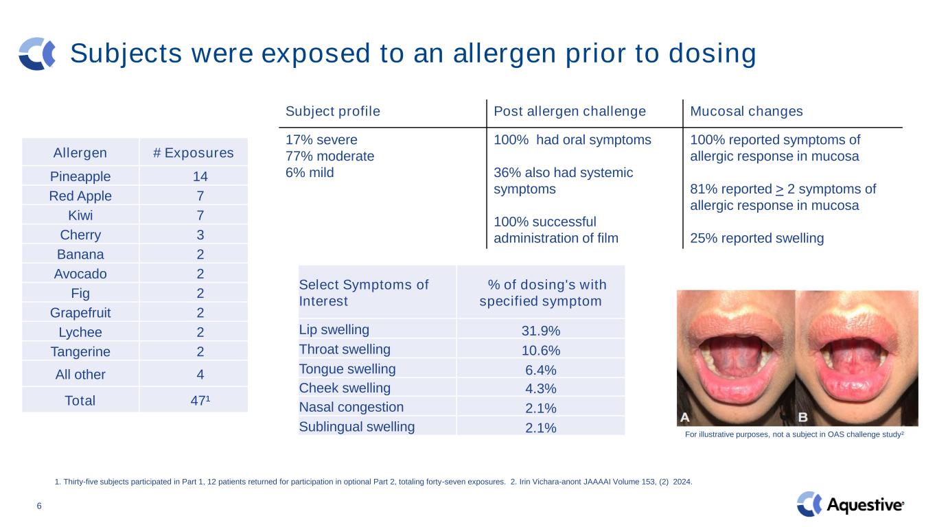Advancing medicines. Solving problems. Improving lives. Subjects were exposed to an allergen prior to dosing 6 Adrenalin (IM) no allergen exposure Allergen # Exposures Pineapple 14 Red Apple 7 Kiwi 7 Cherry 3 Banana 2 Avocado 2 Fig 2 Grapefruit 2 Lychee 2 Tangerine 2 All other 4 Total 47¹ Select Symptoms of Interest % of dosing's with specified symptom Lip swelling 31.9% Throat swelling 10.6% Tongue swelling 6.4% Cheek swelling 4.3% Nasal congestion 2.1% Sublingual swelling 2.1% Subject profile Post allergen challenge Mucosal changes 17% severe 77% moderate 6% mild 100% had oral symptoms 36% also had systemic symptoms 100% successful administration of film 100% reported symptoms of allergic response in mucosa 81% reported > 2 symptoms of allergic response in mucosa 25% r ported swelling 1. Thirty-five subjects participated in Part 1, 12 patients returned for participation in optional Part 2, totaling forty-seven exposures. 2. Irin Vichara-anont JAAAAI Volume 153, (2) 2024. For illustrative purposes, not a subject in OAS challenge study²