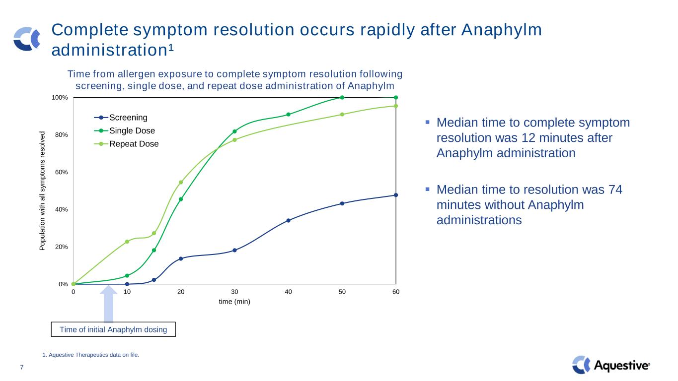 Advancing medicines. Solving problems. Improving lives. Complete symptom resolution occurs rapidly after Anaphylm administration¹ ▪ Median time to complete symptom resolution was 12 minutes after Anaphylm administration ▪ Median time to resolution was 74 minutes without Anaphylm administrations 7 0% 20% 40% 60% 80% 100% 0 10 20 30 40 50 60 P o p u la ti o n w it h a ll s y m p to m s r e s o lv e d time (min) Screening Single Dose Repeat Dose Time of initial Anaphylm dosing 1. Aquestive Therapeutics data on file. Time from allergen exposure to complete symptom resolution following screening, single dose, and repeat dose administration of Anaphylm