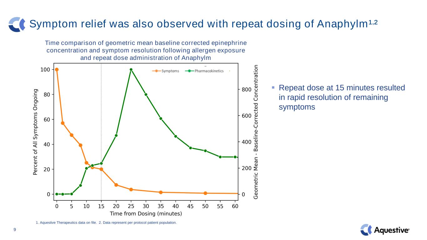 Advancing medicines. Solving problems. Improving lives. Symptom relief correlates to Anaphylm PK levels¹,² 8 1. Aquestive Therapeutics data on file. 2. Data represent per protocol patient population. Time comparison of geometric mean baseline corrected epinephrine concentration and symptom resolution following allergen exposure and single dose administration of Anaphylm ▪ Symptom resolution was observed as early as 2 minutes in some subjects ▪ Median symptom resolution was 5 minutes