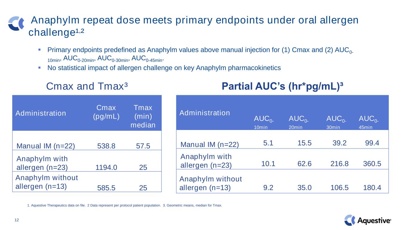 Advancing medicines. Solving problems. Improving lives. 11 Anaphylm single dose meets primary endpoints under oral allergen challenge¹,² Administration AUC0- 10min AUC0- 20min AUC0- 30min AUC0- 45min Manual IM (n=24) 6.0 18.9 39.0 76.0 Anaphylm with allergen (n=23) 14.4 63.2 97.0 132.1 Anaphylm without allergen (n=15) 11.0 50.3 82.6 124.1 Administration Cmax (pg/mL) Median Tmax (min) Manual IM (n=24) 261.2 50 Anaphylm with allergen (n=23) 403.5 12 Anaphylm without allergen (n=15) 372.8 12 Cmax and Tmax³ Partial AUC’s (hr*pg/mL)³ ▪ Primary endpoints predefined as Anaphylm values above manual injection for maximum concentration (1) Cmax and (2) AUC0-10min, AUC0-20min, AUC0-30min, AUC0-45min. ▪ No statistical impact of allergen challenge on key Anaphylm pharmacokinetics 1. Aquestive Therapeutics data on file. 2 Data represent per protocol patient population. 3. Geometric means, median for Tmax.