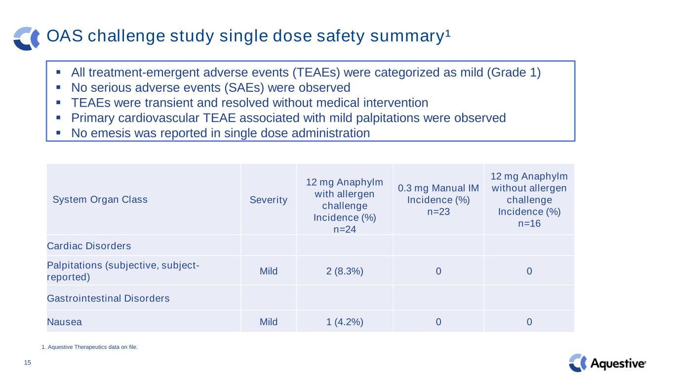 Advancing medicines. Solving problems. Improving lives. 14 Repeat dose pharmacodynamics¹,² Anaphylm elicits the desired pharmacodynamic response in key metrics of SBP, DBP and HR, consistent with and without allergen exposure 1. Aquestive Therapeutics data on file. 2. Data represent per protocol patient population..