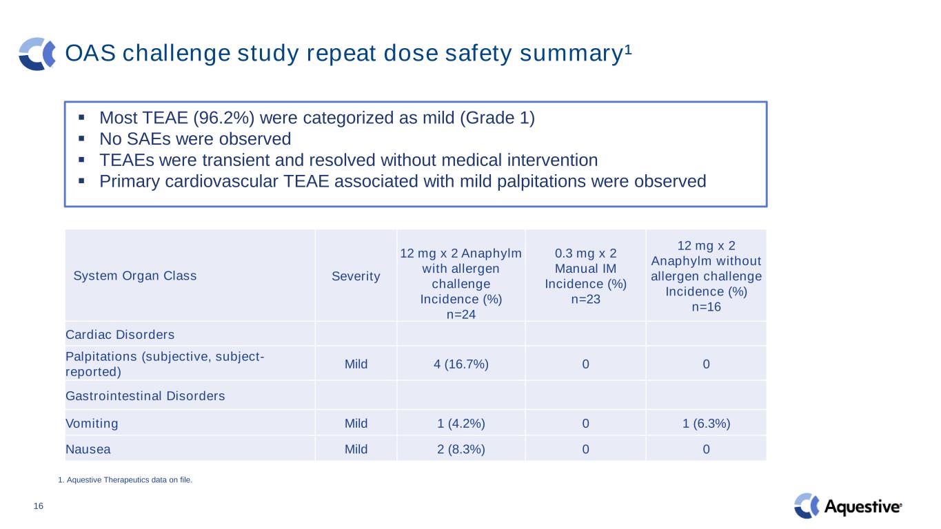 Advancing medicines. Solving problems. Improving lives. 15 OAS challenge study single dose safety summary¹ ▪ All treatment-emergent adverse events (TEAEs) were categorized as mild (Grade 1) ▪ No serious adverse events (SAEs) were observed ▪ TEAEs were transient and resolved without medical intervention ▪ Primary cardiovascular TEAE associated with mild palpitations were observed ▪ No emesis was reported in single dose administration System Organ Class Severity 12 mg Anaphylm with allergen challenge Incidence (%) n=24 0.3 mg Manual IM Incidence (%) n=23 12 mg Anaphylm without allergen challenge Incidence (%) n=16 Cardiac Disorders Palpitations (subjective, subject- reported) Mild 2 (8.3%) 0 0 Gastrointestinal Disorders Nausea Mild 1 (4.2%) 0 0 1. Aquestive Therapeutics data on file.