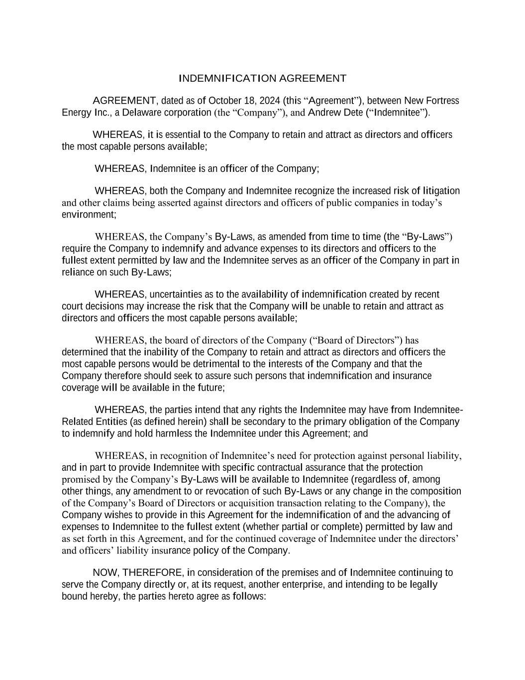INDEMNIFICATION AGREEMENT AGREEMENT, dated as of October 18, 2024 (this “Agreement”), between New Fortress Energy Inc., a Delaware corporation (the “Company”), and Andrew Dete (“Indemnitee”). WHEREAS, it is essential to the Company to retain and attract as directors and officers the most capable persons available; WHEREAS, Indemnitee is an officer of the Company; WHEREAS, both the Company and Indemnitee recognize the increased risk of litigation and other claims being asserted against directors and officers of public companies in today’s environment; WHEREAS, the Company’s By-Laws, as amended from time to time (the “By-Laws”) require the Company to indemnify and advance expenses to its directors and officers to the fullest extent permitted by law and the Indemnitee serves as an officer of the Company in part in reliance on such By-Laws; WHEREAS, uncertainties as to the availability of indemnification created by recent court decisions may increase the risk that the Company will be unable to retain and attract as directors and officers the most capable persons available; WHEREAS, the board of directors of the Company (“Board of Directors”) has determined that the inability of the Company to retain and attract as directors and officers the most capable persons would be detrimental to the interests of the Company and that the Company therefore should seek to assure such persons that indemnification and insurance coverage will be available in the future; WHEREAS, the parties intend that any rights the Indemnitee may have from Indemnitee- Related Entities (as defined herein) shall be secondary to the primary obligation of the Company to indemnify and hold harmless the Indemnitee under this Agreement; and WHEREAS, in recognition of Indemnitee’s need for protection against personal liability, and in part to provide Indemnitee with specific contractual assurance that the protection promised by the Company’s By-Laws will be available to Indemnitee (regardless of, among other things, any amendment to or revocation of such By-Laws or any change in the composition of the Company’s Board of Directors or acquisition transaction relating to the Company), the Company wishes to provide in this Agreement for the indemnification of and the advancing of expenses to Indemnitee to the fullest extent (whether partial or complete) permitted by law and as set forth in this Agreement, and for the continued coverage of Indemnitee under the directors’ and officers’ liability insurance policy of the Company. NOW, THEREFORE, in consideration of the premises and of Indemnitee continuing to serve the Company directly or, at its request, another enterprise, and intending to be legally bound hereby, the parties hereto agree as follows: