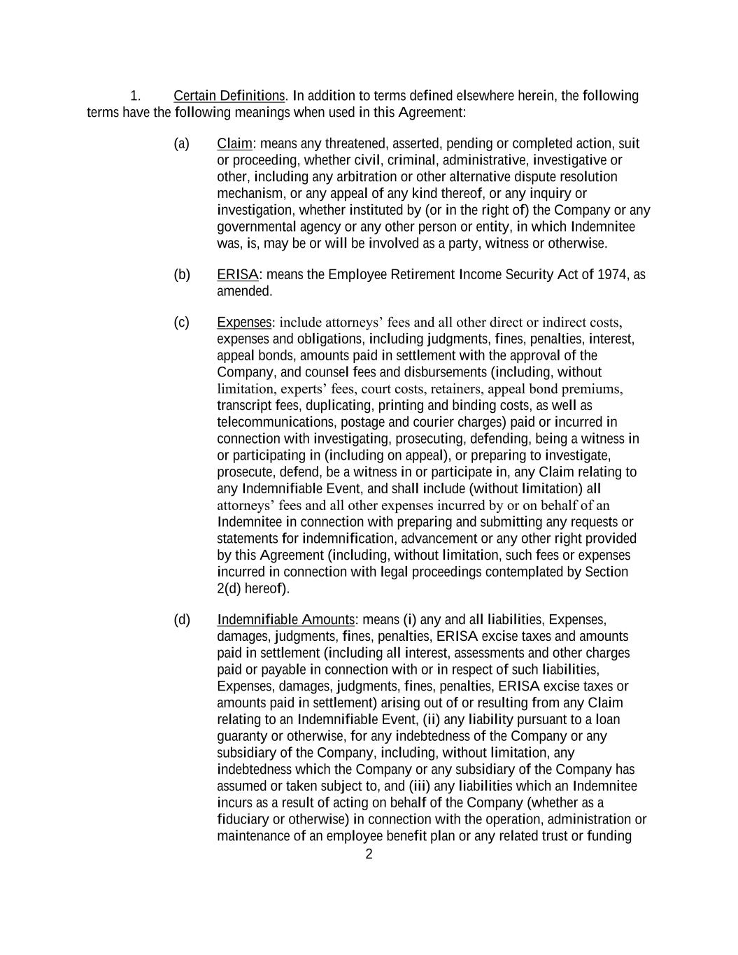 2 1. Certain Definitions. In addition to terms defined elsewhere herein, the following terms have the following meanings when used in this Agreement: (a) Claim: means any threatened, asserted, pending or completed action, suit or proceeding, whether civil, criminal, administrative, investigative or other, including any arbitration or other alternative dispute resolution mechanism, or any appeal of any kind thereof, or any inquiry or investigation, whether instituted by (or in the right of) the Company or any governmental agency or any other person or entity, in which Indemnitee was, is, may be or will be involved as a party, witness or otherwise. (b) ERISA: means the Employee Retirement Income Security Act of 1974, as amended. (c) Expenses: include attorneys’ fees and all other direct or indirect costs, expenses and obligations, including judgments, fines, penalties, interest, appeal bonds, amounts paid in settlement with the approval of the Company, and counsel fees and disbursements (including, without limitation, experts’ fees, court costs, retainers, appeal bond premiums, transcript fees, duplicating, printing and binding costs, as well as telecommunications, postage and courier charges) paid or incurred in connection with investigating, prosecuting, defending, being a witness in or participating in (including on appeal), or preparing to investigate, prosecute, defend, be a witness in or participate in, any Claim relating to any Indemnifiable Event, and shall include (without limitation) all attorneys’ fees and all other expenses incurred by or on behalf of an Indemnitee in connection with preparing and submitting any requests or statements for indemnification, advancement or any other right provided by this Agreement (including, without limitation, such fees or expenses incurred in connection with legal proceedings contemplated by Section 2(d) hereof). (d) Indemnifiable Amounts: means (i) any and all liabilities, Expenses, damages, judgments, fines, penalties, ERISA excise taxes and amounts paid in settlement (including all interest, assessments and other charges paid or payable in connection with or in respect of such liabilities, Expenses, damages, judgments, fines, penalties, ERISA excise taxes or amounts paid in settlement) arising out of or resulting from any Claim relating to an Indemnifiable Event, (ii) any liability pursuant to a loan guaranty or otherwise, for any indebtedness of the Company or any subsidiary of the Company, including, without limitation, any indebtedness which the Company or any subsidiary of the Company has assumed or taken subject to, and (iii) any liabilities which an Indemnitee incurs as a result of acting on behalf of the Company (whether as a fiduciary or otherwise) in connection with the operation, administration or maintenance of an employee benefit plan or any related trust or funding