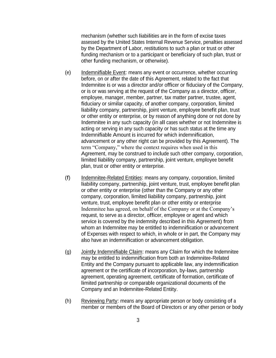 3 mechanism (whether such liabilities are in the form of excise taxes assessed by the United States Internal Revenue Service, penalties assessed by the Department of Labor, restitutions to such a plan or trust or other funding mechanism or to a participant or beneficiary of such plan, trust or other funding mechanism, or otherwise). (e) Indemnifiable Event: means any event or occurrence, whether occurring before, on or after the date of this Agreement, related to the fact that Indemnitee is or was a director and/or officer or fiduciary of the Company, or is or was serving at the request of the Company as a director, officer, employee, manager, member, partner, tax matter partner, trustee, agent, fiduciary or similar capacity, of another company, corporation, limited liability company, partnership, joint venture, employee benefit plan, trust or other entity or enterprise, or by reason of anything done or not done by Indemnitee in any such capacity (in all cases whether or not Indemnitee is acting or serving in any such capacity or has such status at the time any Indemnifiable Amount is incurred for which indemnification, advancement or any other right can be provided by this Agreement). The term “Company,” where the context requires when used in this Agreement, may be construed to include such other company, corporation, limited liability company, partnership, joint venture, employee benefit plan, trust or other entity or enterprise. (f) Indemnitee-Related Entities: means any company, corporation, limited liability company, partnership, joint venture, trust, employee benefit plan or other entity or enterprise (other than the Company or any other company, corporation, limited liability company, partnership, joint venture, trust, employee benefit plan or other entity or enterprise Indemnitee has agreed, on behalf of the Company or at the Company’s request, to serve as a director, officer, employee or agent and which service is covered by the indemnity described in this Agreement) from whom an Indemnitee may be entitled to indemnification or advancement of Expenses with respect to which, in whole or in part, the Company may also have an indemnification or advancement obligation. (g) Jointly Indemnifiable Claim: means any Claim for which the Indemnitee may be entitled to indemnification from both an Indemnitee-Related Entity and the Company pursuant to applicable law, any indemnification agreement or the certificate of incorporation, by-laws, partnership agreement, operating agreement, certificate of formation, certificate of limited partnership or comparable organizational documents of the Company and an Indemnitee-Related Entity. (h) Reviewing Party: means any appropriate person or body consisting of a member or members of the Board of Directors or any other person or body