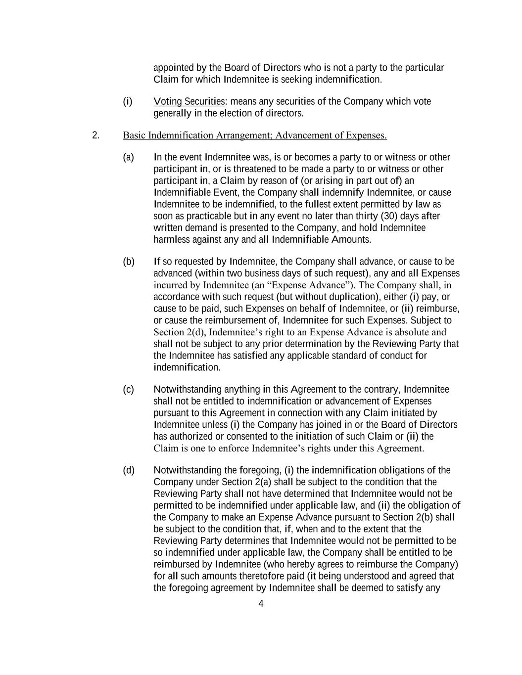 4 appointed by the Board of Directors who is not a party to the particular Claim for which Indemnitee is seeking indemnification. (i) Voting Securities: means any securities of the Company which vote generally in the election of directors. 2. Basic Indemnification Arrangement; Advancement of Expenses. (a) In the event Indemnitee was, is or becomes a party to or witness or other participant in, or is threatened to be made a party to or witness or other participant in, a Claim by reason of (or arising in part out of) an Indemnifiable Event, the Company shall indemnify Indemnitee, or cause Indemnitee to be indemnified, to the fullest extent permitted by law as soon as practicable but in any event no later than thirty (30) days after written demand is presented to the Company, and hold Indemnitee harmless against any and all Indemnifiable Amounts. (b) If so requested by Indemnitee, the Company shall advance, or cause to be advanced (within two business days of such request), any and all Expenses incurred by Indemnitee (an “Expense Advance”). The Company shall, in accordance with such request (but without duplication), either (i) pay, or cause to be paid, such Expenses on behalf of Indemnitee, or (ii) reimburse, or cause the reimbursement of, Indemnitee for such Expenses. Subject to Section 2(d), Indemnitee’s right to an Expense Advance is absolute and shall not be subject to any prior determination by the Reviewing Party that the Indemnitee has satisfied any applicable standard of conduct for indemnification. (c) Notwithstanding anything in this Agreement to the contrary, Indemnitee shall not be entitled to indemnification or advancement of Expenses pursuant to this Agreement in connection with any Claim initiated by Indemnitee unless (i) the Company has joined in or the Board of Directors has authorized or consented to the initiation of such Claim or (ii) the Claim is one to enforce Indemnitee’s rights under this Agreement. (d) Notwithstanding the foregoing, (i) the indemnification obligations of the Company under Section 2(a) shall be subject to the condition that the Reviewing Party shall not have determined that Indemnitee would not be permitted to be indemnified under applicable law, and (ii) the obligation of the Company to make an Expense Advance pursuant to Section 2(b) shall be subject to the condition that, if, when and to the extent that the Reviewing Party determines that Indemnitee would not be permitted to be so indemnified under applicable law, the Company shall be entitled to be reimbursed by Indemnitee (who hereby agrees to reimburse the Company) for all such amounts theretofore paid (it being understood and agreed that the foregoing agreement by Indemnitee shall be deemed to satisfy any