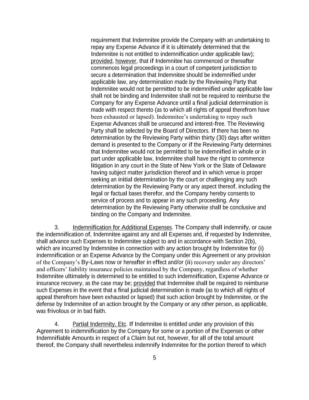 5 requirement that Indemnitee provide the Company with an undertaking to repay any Expense Advance if it is ultimately determined that the Indemnitee is not entitled to indemnification under applicable law); provided, however, that if Indemnitee has commenced or thereafter commences legal proceedings in a court of competent jurisdiction to secure a determination that Indemnitee should be indemnified under applicable law, any determination made by the Reviewing Party that Indemnitee would not be permitted to be indemnified under applicable law shall not be binding and Indemnitee shall not be required to reimburse the Company for any Expense Advance until a final judicial determination is made with respect thereto (as to which all rights of appeal therefrom have been exhausted or lapsed). Indemnitee’s undertaking to repay such Expense Advances shall be unsecured and interest-free. The Reviewing Party shall be selected by the Board of Directors. If there has been no determination by the Reviewing Party within thirty (30) days after written demand is presented to the Company or if the Reviewing Party determines that Indemnitee would not be permitted to be indemnified in whole or in part under applicable law, Indemnitee shall have the right to commence litigation in any court in the State of New York or the State of Delaware having subject matter jurisdiction thereof and in which venue is proper seeking an initial determination by the court or challenging any such determination by the Reviewing Party or any aspect thereof, including the legal or factual bases therefor, and the Company hereby consents to service of process and to appear in any such proceeding. Any determination by the Reviewing Party otherwise shall be conclusive and binding on the Company and Indemnitee. 3. Indemnification for Additional Expenses. The Company shall indemnify, or cause the indemnification of, Indemnitee against any and all Expenses and, if requested by Indemnitee, shall advance such Expenses to Indemnitee subject to and in accordance with Section 2(b), which are incurred by Indemnitee in connection with any action brought by Indemnitee for (i) indemnification or an Expense Advance by the Company under this Agreement or any provision of the Company’s By-Laws now or hereafter in effect and/or (ii) recovery under any directors’ and officers’ liability insurance policies maintained by the Company, regardless of whether Indemnitee ultimately is determined to be entitled to such indemnification, Expense Advance or insurance recovery, as the case may be; provided that Indemnitee shall be required to reimburse such Expenses in the event that a final judicial determination is made (as to which all rights of appeal therefrom have been exhausted or lapsed) that such action brought by Indemnitee, or the defense by Indemnitee of an action brought by the Company or any other person, as applicable, was frivolous or in bad faith. 4. Partial Indemnity, Etc. If Indemnitee is entitled under any provision of this Agreement to indemnification by the Company for some or a portion of the Expenses or other Indemnifiable Amounts in respect of a Claim but not, however, for all of the total amount thereof, the Company shall nevertheless indemnify Indemnitee for the portion thereof to which