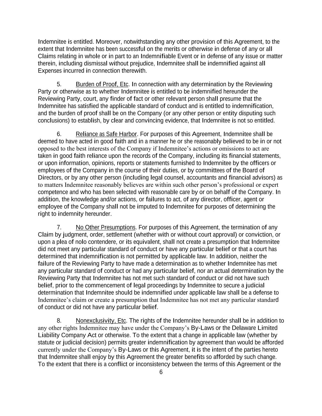 6 Indemnitee is entitled. Moreover, notwithstanding any other provision of this Agreement, to the extent that Indemnitee has been successful on the merits or otherwise in defense of any or all Claims relating in whole or in part to an Indemnifiable Event or in defense of any issue or matter therein, including dismissal without prejudice, Indemnitee shall be indemnified against all Expenses incurred in connection therewith. 5. Burden of Proof, Etc. In connection with any determination by the Reviewing Party or otherwise as to whether Indemnitee is entitled to be indemnified hereunder the Reviewing Party, court, any finder of fact or other relevant person shall presume that the Indemnitee has satisfied the applicable standard of conduct and is entitled to indemnification, and the burden of proof shall be on the Company (or any other person or entity disputing such conclusions) to establish, by clear and convincing evidence, that Indemnitee is not so entitled. 6. Reliance as Safe Harbor. For purposes of this Agreement, Indemnitee shall be deemed to have acted in good faith and in a manner he or she reasonably believed to be in or not opposed to the best interests of the Company if Indemnitee’s actions or omissions to act are taken in good faith reliance upon the records of the Company, including its financial statements, or upon information, opinions, reports or statements furnished to Indemnitee by the officers or employees of the Company in the course of their duties, or by committees of the Board of Directors, or by any other person (including legal counsel, accountants and financial advisors) as to matters Indemnitee reasonably believes are within such other person’s professional or expert competence and who has been selected with reasonable care by or on behalf of the Company. In addition, the knowledge and/or actions, or failures to act, of any director, officer, agent or employee of the Company shall not be imputed to Indemnitee for purposes of determining the right to indemnity hereunder. 7. No Other Presumptions. For purposes of this Agreement, the termination of any Claim by judgment, order, settlement (whether with or without court approval) or conviction, or upon a plea of nolo contendere, or its equivalent, shall not create a presumption that Indemnitee did not meet any particular standard of conduct or have any particular belief or that a court has determined that indemnification is not permitted by applicable law. In addition, neither the failure of the Reviewing Party to have made a determination as to whether Indemnitee has met any particular standard of conduct or had any particular belief, nor an actual determination by the Reviewing Party that Indemnitee has not met such standard of conduct or did not have such belief, prior to the commencement of legal proceedings by Indemnitee to secure a judicial determination that Indemnitee should be indemnified under applicable law shall be a defense to Indemnitee’s claim or create a presumption that Indemnitee has not met any particular standard of conduct or did not have any particular belief. 8. Nonexclusivity, Etc. The rights of the Indemnitee hereunder shall be in addition to any other rights Indemnitee may have under the Company’s By-Laws or the Delaware Limited Liability Company Act or otherwise. To the extent that a change in applicable law (whether by statute or judicial decision) permits greater indemnification by agreement than would be afforded currently under the Company’s By-Laws or this Agreement, it is the intent of the parties hereto that Indemnitee shall enjoy by this Agreement the greater benefits so afforded by such change. To the extent that there is a conflict or inconsistency between the terms of this Agreement or the