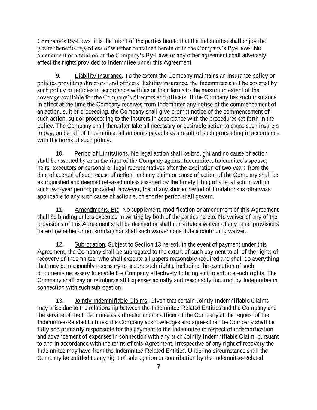 7 Company’s By-Laws, it is the intent of the parties hereto that the Indemnitee shall enjoy the greater benefits regardless of whether contained herein or in the Company’s By-Laws. No amendment or alteration of the Company’s By-Laws or any other agreement shall adversely affect the rights provided to Indemnitee under this Agreement. 9. Liability Insurance. To the extent the Company maintains an insurance policy or policies providing directors’ and officers’ liability insurance, the Indemnitee shall be covered by such policy or policies in accordance with its or their terms to the maximum extent of the coverage available for the Company’s directors and officers. If the Company has such insurance in effect at the time the Company receives from Indemnitee any notice of the commencement of an action, suit or proceeding, the Company shall give prompt notice of the commencement of such action, suit or proceeding to the insurers in accordance with the procedures set forth in the policy. The Company shall thereafter take all necessary or desirable action to cause such insurers to pay, on behalf of Indemnitee, all amounts payable as a result of such proceeding in accordance with the terms of such policy. 10. Period of Limitations. No legal action shall be brought and no cause of action shall be asserted by or in the right of the Company against Indemnitee, Indemnitee’s spouse, heirs, executors or personal or legal representatives after the expiration of two years from the date of accrual of such cause of action, and any claim or cause of action of the Company shall be extinguished and deemed released unless asserted by the timely filing of a legal action within such two-year period; provided, however, that if any shorter period of limitations is otherwise applicable to any such cause of action such shorter period shall govern. 11. Amendments, Etc. No supplement, modification or amendment of this Agreement shall be binding unless executed in writing by both of the parties hereto. No waiver of any of the provisions of this Agreement shall be deemed or shall constitute a waiver of any other provisions hereof (whether or not similar) nor shall such waiver constitute a continuing waiver. 12. Subrogation. Subject to Section 13 hereof, in the event of payment under this Agreement, the Company shall be subrogated to the extent of such payment to all of the rights of recovery of Indemnitee, who shall execute all papers reasonably required and shall do everything that may be reasonably necessary to secure such rights, including the execution of such documents necessary to enable the Company effectively to bring suit to enforce such rights. The Company shall pay or reimburse all Expenses actually and reasonably incurred by Indemnitee in connection with such subrogation. 13. Jointly Indemnifiable Claims. Given that certain Jointly Indemnifiable Claims may arise due to the relationship between the Indemnitee-Related Entities and the Company and the service of the Indemnitee as a director and/or officer of the Company at the request of the Indemnitee-Related Entities, the Company acknowledges and agrees that the Company shall be fully and primarily responsible for the payment to the Indemnitee in respect of indemnification and advancement of expenses in connection with any such Jointly Indemnifiable Claim, pursuant to and in accordance with the terms of this Agreement, irrespective of any right of recovery the Indemnitee may have from the Indemnitee-Related Entities. Under no circumstance shall the Company be entitled to any right of subrogation or contribution by the Indemnitee-Related