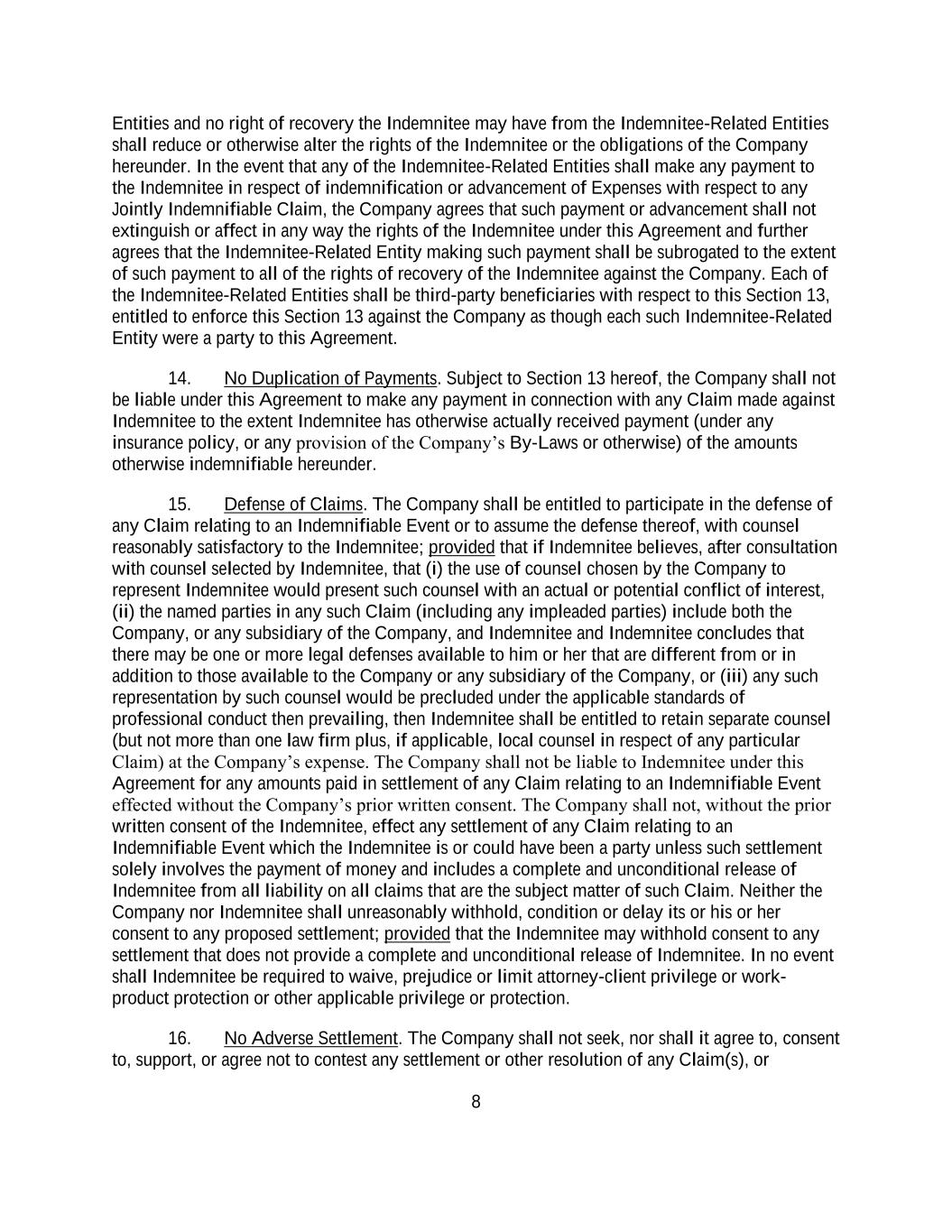 8 Entities and no right of recovery the Indemnitee may have from the Indemnitee-Related Entities shall reduce or otherwise alter the rights of the Indemnitee or the obligations of the Company hereunder. In the event that any of the Indemnitee-Related Entities shall make any payment to the Indemnitee in respect of indemnification or advancement of Expenses with respect to any Jointly Indemnifiable Claim, the Company agrees that such payment or advancement shall not extinguish or affect in any way the rights of the Indemnitee under this Agreement and further agrees that the Indemnitee-Related Entity making such payment shall be subrogated to the extent of such payment to all of the rights of recovery of the Indemnitee against the Company. Each of the Indemnitee-Related Entities shall be third-party beneficiaries with respect to this Section 13, entitled to enforce this Section 13 against the Company as though each such Indemnitee-Related Entity were a party to this Agreement. 14. No Duplication of Payments. Subject to Section 13 hereof, the Company shall not be liable under this Agreement to make any payment in connection with any Claim made against Indemnitee to the extent Indemnitee has otherwise actually received payment (under any insurance policy, or any provision of the Company’s By-Laws or otherwise) of the amounts otherwise indemnifiable hereunder. 15. Defense of Claims. The Company shall be entitled to participate in the defense of any Claim relating to an Indemnifiable Event or to assume the defense thereof, with counsel reasonably satisfactory to the Indemnitee; provided that if Indemnitee believes, after consultation with counsel selected by Indemnitee, that (i) the use of counsel chosen by the Company to represent Indemnitee would present such counsel with an actual or potential conflict of interest, (ii) the named parties in any such Claim (including any impleaded parties) include both the Company, or any subsidiary of the Company, and Indemnitee and Indemnitee concludes that there may be one or more legal defenses available to him or her that are different from or in addition to those available to the Company or any subsidiary of the Company, or (iii) any such representation by such counsel would be precluded under the applicable standards of professional conduct then prevailing, then Indemnitee shall be entitled to retain separate counsel (but not more than one law firm plus, if applicable, local counsel in respect of any particular Claim) at the Company’s expense. The Company shall not be liable to Indemnitee under this Agreement for any amounts paid in settlement of any Claim relating to an Indemnifiable Event effected without the Company’s prior written consent. The Company shall not, without the prior written consent of the Indemnitee, effect any settlement of any Claim relating to an Indemnifiable Event which the Indemnitee is or could have been a party unless such settlement solely involves the payment of money and includes a complete and unconditional release of Indemnitee from all liability on all claims that are the subject matter of such Claim. Neither the Company nor Indemnitee shall unreasonably withhold, condition or delay its or his or her consent to any proposed settlement; provided that the Indemnitee may withhold consent to any settlement that does not provide a complete and unconditional release of Indemnitee. In no event shall Indemnitee be required to waive, prejudice or limit attorney-client privilege or work- product protection or other applicable privilege or protection. 16. No Adverse Settlement. The Company shall not seek, nor shall it agree to, consent to, support, or agree not to contest any settlement or other resolution of any Claim(s), or