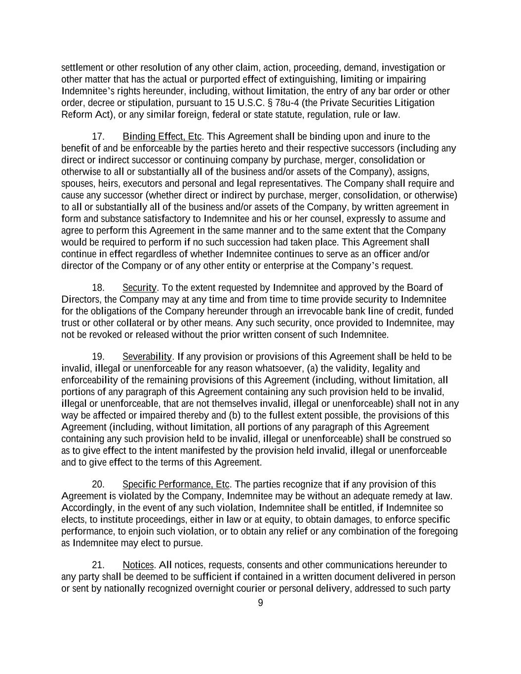 9 settlement or other resolution of any other claim, action, proceeding, demand, investigation or other matter that has the actual or purported effect of extinguishing, limiting or impairing Indemnitee’s rights hereunder, including, without limitation, the entry of any bar order or other order, decree or stipulation, pursuant to 15 U.S.C. § 78u-4 (the Private Securities Litigation Reform Act), or any similar foreign, federal or state statute, regulation, rule or law. 17. Binding Effect, Etc. This Agreement shall be binding upon and inure to the benefit of and be enforceable by the parties hereto and their respective successors (including any direct or indirect successor or continuing company by purchase, merger, consolidation or otherwise to all or substantially all of the business and/or assets of the Company), assigns, spouses, heirs, executors and personal and legal representatives. The Company shall require and cause any successor (whether direct or indirect by purchase, merger, consolidation, or otherwise) to all or substantially all of the business and/or assets of the Company, by written agreement in form and substance satisfactory to Indemnitee and his or her counsel, expressly to assume and agree to perform this Agreement in the same manner and to the same extent that the Company would be required to perform if no such succession had taken place. This Agreement shall continue in effect regardless of whether Indemnitee continues to serve as an officer and/or director of the Company or of any other entity or enterprise at the Company’s request. 18. Security. To the extent requested by Indemnitee and approved by the Board of Directors, the Company may at any time and from time to time provide security to Indemnitee for the obligations of the Company hereunder through an irrevocable bank line of credit, funded trust or other collateral or by other means. Any such security, once provided to Indemnitee, may not be revoked or released without the prior written consent of such Indemnitee. 19. Severability. If any provision or provisions of this Agreement shall be held to be invalid, illegal or unenforceable for any reason whatsoever, (a) the validity, legality and enforceability of the remaining provisions of this Agreement (including, without limitation, all portions of any paragraph of this Agreement containing any such provision held to be invalid, illegal or unenforceable, that are not themselves invalid, illegal or unenforceable) shall not in any way be affected or impaired thereby and (b) to the fullest extent possible, the provisions of this Agreement (including, without limitation, all portions of any paragraph of this Agreement containing any such provision held to be invalid, illegal or unenforceable) shall be construed so as to give effect to the intent manifested by the provision held invalid, illegal or unenforceable and to give effect to the terms of this Agreement. 20. Specific Performance, Etc. The parties recognize that if any provision of this Agreement is violated by the Company, Indemnitee may be without an adequate remedy at law. Accordingly, in the event of any such violation, Indemnitee shall be entitled, if Indemnitee so elects, to institute proceedings, either in law or at equity, to obtain damages, to enforce specific performance, to enjoin such violation, or to obtain any relief or any combination of the foregoing as Indemnitee may elect to pursue. 21. Notices. All notices, requests, consents and other communications hereunder to any party shall be deemed to be sufficient if contained in a written document delivered in person or sent by nationally recognized overnight courier or personal delivery, addressed to such party