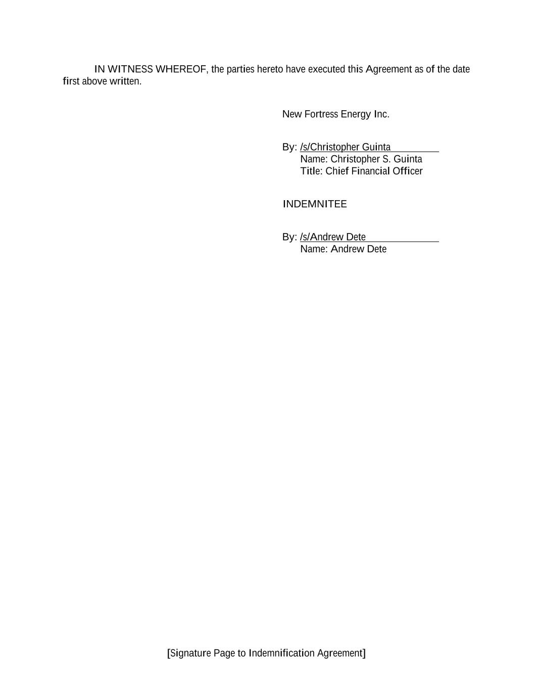 [Signature Page to Indemnification Agreement] IN WITNESS WHEREOF, the parties hereto have executed this Agreement as of the date first above written. New Fortress Energy Inc. By: /s/Christopher Guinta Name: Christopher S. Guinta Title: Chief Financial Officer INDEMNITEE By: /s/Andrew Dete Name: Andrew Dete