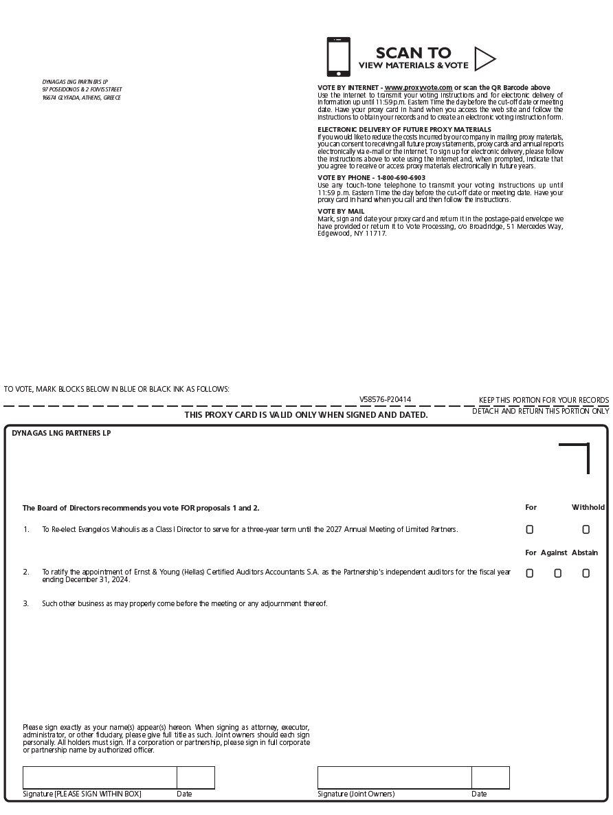 a copy of the press release of Dynagas LNG Partners LP (the “Partnership”), dated October 25, 2024, announcing that its 2024 Annual Meeting of Limited Partners is scheduled to be held on November 29, 2024 (the “2024 Annual Meeting”).