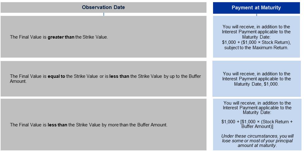 Payment at Maturity: If the Final Value is greater than the Strike Value, your payment at maturity per $1,000 principal amount note, in addition to the Interest Payment applicable to the Maturity Date, will be calculated as follows: $1,000 + ($1,000 × Stock Return), subject to the Maximum Return If the Final Value is equal to the Strike Value or is less than the Strike Value by up to the Buffer Amount, you will receive, in addition to the Interest Payment applicable to the Maturity Date, the principal amount of your notes at maturity. If the Final Value is less than the Strike Value by more than the Buffer Amount, your payment at maturity per $1,000 principal amount note, in addition to the Interest Payment applicable to the Maturity Date, will be calculated as follows: $1,000 + [$1,000 × (Stock Return + Buffer Amount)] If the Final Value is less than the Strike Value by more than the Buffer Amount, you will lose some or most of your principal amount at maturity. Stock Return: (Final Value – Strike Value) Strike