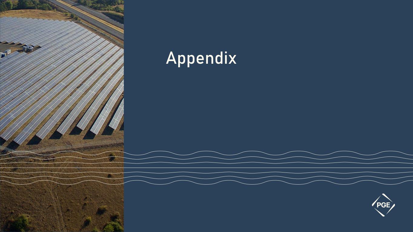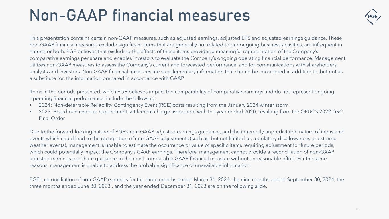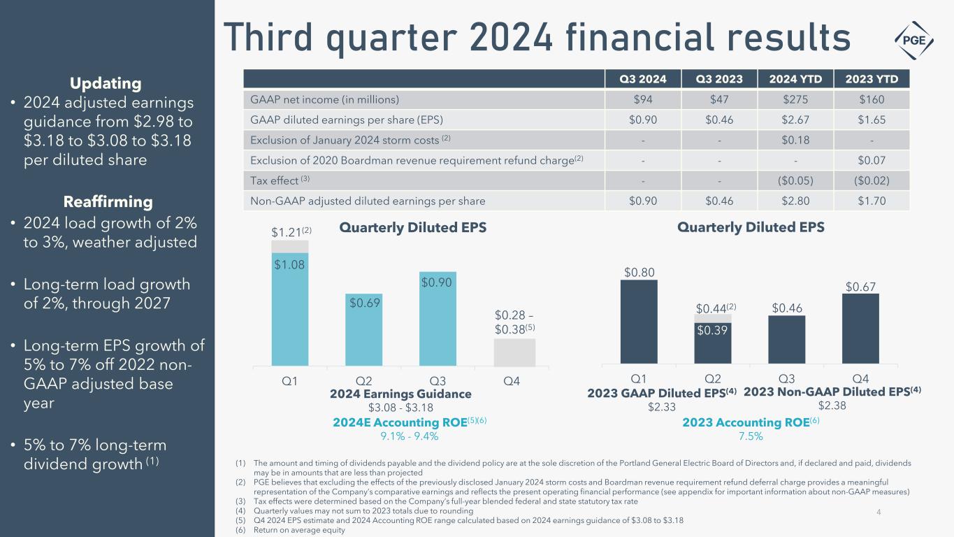 Cautionary statement Information Current as of October 25, 2024 Except as expressly noted, the information in this presentation is current as of October 25, 2024 – the date on which PGE filed its Quarterly Report on Form 10-Q for the quarter ended September 30, 2024 - and should not be relied upon as being current as of any subsequent date. PGE undertakes no duty to update this presentation, except as may be required by law. Forward-Looking Statement Statements in this presentation that relate to future plans, objectives, expectations, performance, events and the like may constitute "forward-looking statements" within the meaning of the Private Securities Litigation Reform Act of 1995, Section 27A of the Securities Act of 1933, as amended, and Section 21E of the Securities Exchange Act of 1934, as amended. These forward- looking statements represent our estimates and assumptions as of the date of this report. The Company assumes no obligation to update or revise any forward-looking statement as a result of new information, future events or other factors. Forward-looking statements include statements regarding the Company's full-year earnings guidance (including assumptions and expectations regarding annual retail deliveries, average hydro conditions, wind generation, normal thermal plant operations, operating and maintenance expense and depreciation and amortization expense) as well as other statements containing words such as "anticipates," "assumptions," "based on," "believes," "conditioned upon," "considers," "could," "estimates," "expects," “expected,” "forecast," "goals," "intends," "needs," "plans," "predicts," "projects," "promises," "seeks," "should," "subject to," "targets," "will continue," "will likely result," or similar expressions. Investors are cautioned that any such forward-looking statements are subject to risks and uncertainties, including, without limitation: the timing or outcome of various legal and regulatory actions; changing customer expectations and choices that may reduce demand for electricity; the sale of excess energy during periods of low demand or low wholesale market prices; operational risks relating to the Company's generation and battery storage facilities, including hydro conditions, wind conditions, disruption of transmission and distribution, disruption of fuel supply, and unscheduled plant outages, which may result in unanticipated operating, maintenance and repair costs, as well as replacement power costs; delays in the supply chain and increased supply costs (including application of tariffs impacting solar module imports), failure to complete capital projects on schedule or within budget, failure of counterparties to perform under agreement, or the abandonment of capital projects, which could result in the Company's inability to recover project costs, or impact our competitive position, market share, revenues and project margins in material ways; default or nonperformance of counterparties from whom PGE purchases capacity or energy, which require the purchase of replacement power and renewable attributes at increased costs; complications arising from PGE’s jointly-owned plant, including ownership changes, regulatory outcomes or operational failures; changes in, and compliance with, environmental laws and regulations, including those that govern emissions from thermal power plants; changes in weather, hydroelectric and energy market conditions, which could affect the availability, cost and required collateral for purchased power and fuel; changes in the availability and price of wholesale power and fuels; changes in customer growth, or demographic patterns, including changes in load resulting in future transmission constraints, in PGE’s service territory; changes in capital and credit market conditions, including volatility of equity markets as well as changes in PGE’s credit ratings and outlook on such credit ratings, reductions in demand for investment-grade commercial paper or interest rates, which could affect the access to and availability or cost of capital and result in delay or cancellation of capital projects or execution of the Company’s strategic plan as currently envisioned; general economic and financial market conditions, including inflation; the effects of climate change, whether global or local in nature; unseasonable or severe weather conditions, wildfires, and other natural phenomena and natural disasters that could result in operational disruptions, unanticipated restoration costs, third party liability or that may affect energy costs or consumption; the effectiveness of PGE’s risk management policies and procedures; PGE’s ability to effectively implement Public Safety Power Shutoffs (PSPS) and de-energize its system in the event of heightened wildfire risk; cybersecurity attacks, data security breaches, physical attacks and security breaches, or other malicious acts against the Company or against Company vendors, which could disrupt operations, require significant expenditures, or result in claims against the Company; employee workforce factors, including potential strikes, work stoppages, transitions in senior management, and the ability to recruit and retain key employees and other talent and turnover due to macroeconomic trends; widespread health emergencies or outbreaks of infectious diseases, which may affect our financial position, results of operations and cash flows; failure to achieve the Company’s greenhouse gas emission goals or being perceived to have either failed to act responsibly with respect to the environment or effectively responded to legislative requirements concerning greenhouse gas emission reductions; social attitudes regarding the electric utility and power industries; political and economic conditions; acts of war or terrorism; changes in financial or regulatory accounting principles or policies imposed by governing bodies; new federal, state, and local laws that could have adverse