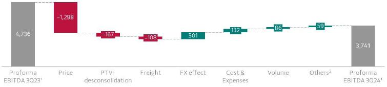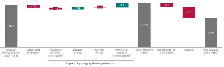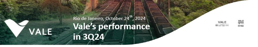 Results Highlights · Operational and sales performance improved across all business segments. Iron ore shipments increased by 1.3 Mt (+2%) y/y, driven by an 18% rise in pellet sales due to higher production and strong demand. · The average realized iron ore fines price was US$ 90.6/t, US$ 7.6/t lower q/q despite iron ore reference prices having decreased by US$ 12.0/t. The lower decline vs. the reference price is attributed to an enhanced product portfolio and positive provisional pricing adjustments. · Proforma Adjusted EBITDA decreased by 6% q/q and 21% y/y, totaling USD 3.7 billion. Higher volumes and lower unit costs, particularly in iron ore, partly offset the impact of lower prices. · Iron ore fines’ C1 cash cost, ex-3rd party purchases, was 17% lower q/q and 6% lower y/y, reaching US$ 20.6/t, driven mainly by: (i) fixed costs dilution due to higher production; (ii) a better production mix, with higher volumes from the Northern System where production costs are lower and (iii) continued efficiency. In September, the C1 production cost reached US$ 18.2/t, indicating a positive performance in Q4. Vale is highly confident in achieving the low-end of its 2024 C1 cash cost guidance, ex-3rd -party purchases, of US$ 21.5-23.0/t. ·